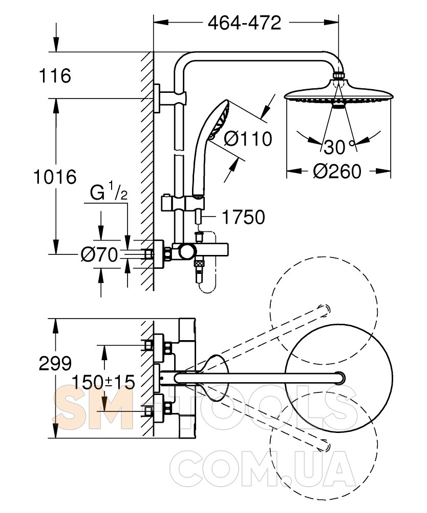 В душевую систему также включена короткая штанга (1016 мм), соединяющая термостат и верхнее крепление системы.