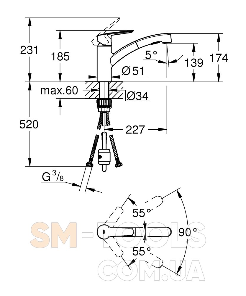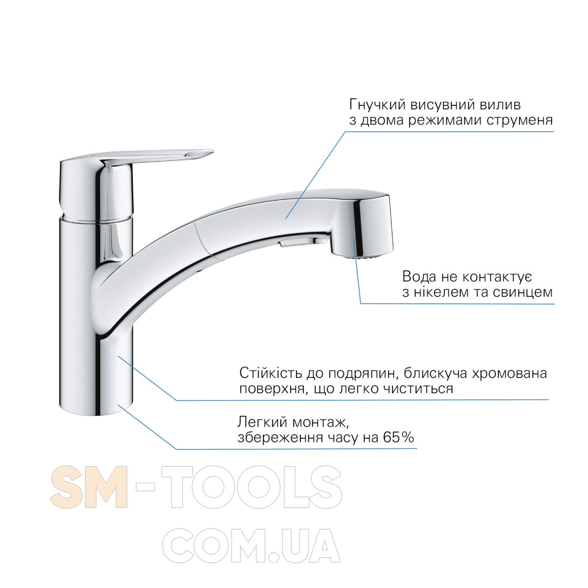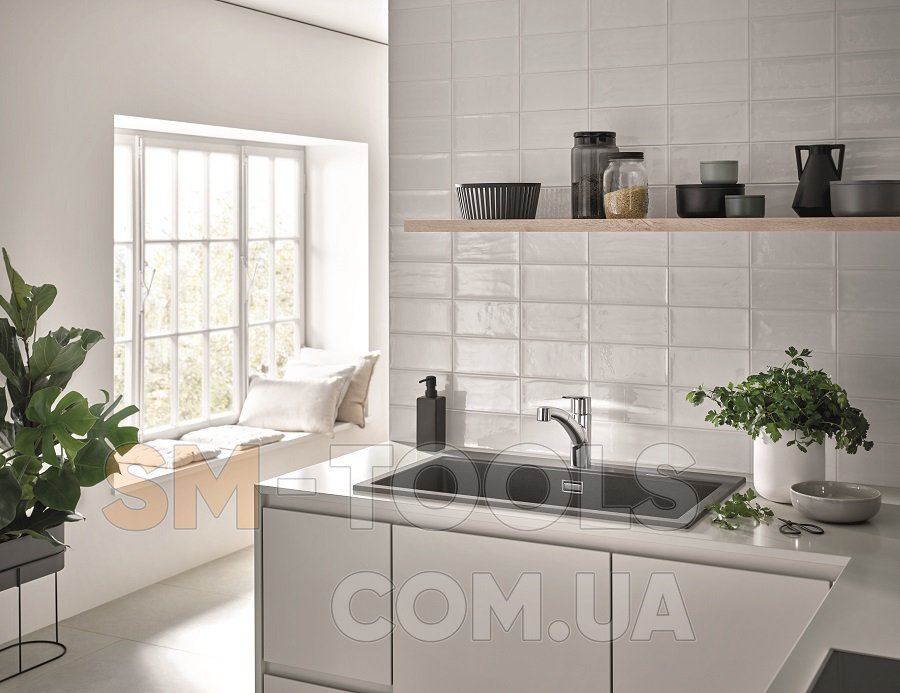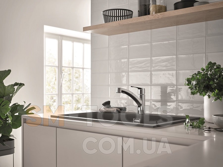 Глянцевая хромированная поверхность GROHE Long-Life Shine устойчива к царапинам и обеспечивает долговечность. GROHE QuickFix Plus позволяет легко и быстро установить этот кухонный смеситель, идеально подходящий для мгновенного обновления кухни. Для этого крана рекомендуется минимальное давление 1,0 бар.