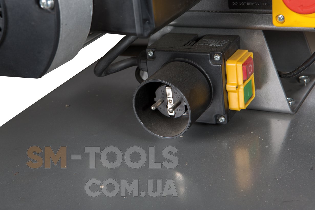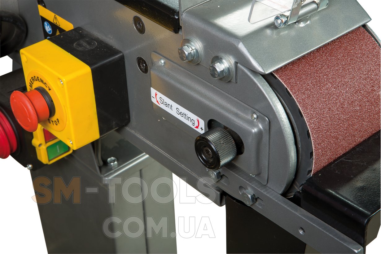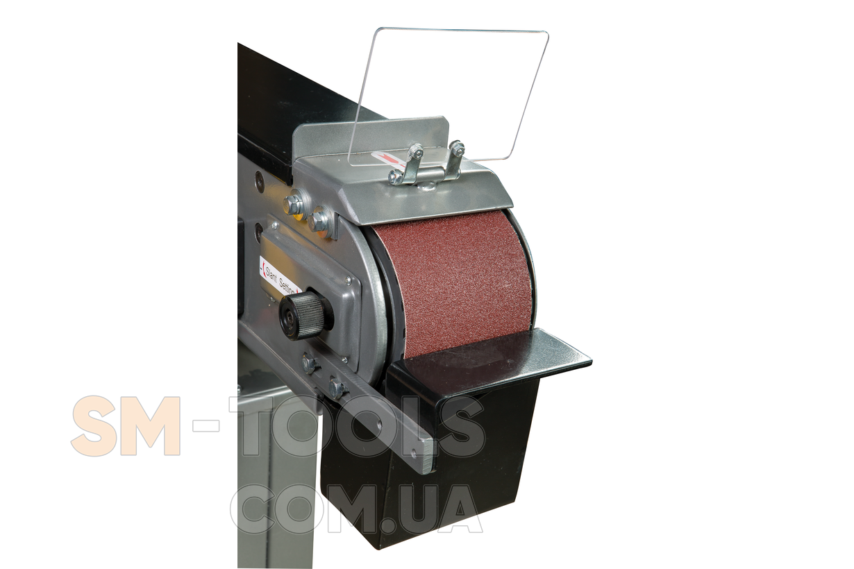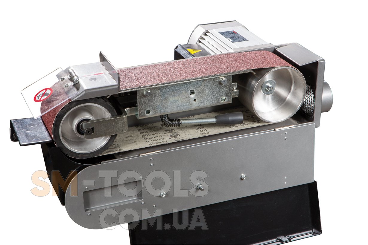 Станок имеет несколько технических решений для обеспечения безопасности оператора. Так, опасная зона над ведомым роликом оборудована защитным козырьком, а верхняя часть ленты может быть закрыта крышкой (когда не требуется обработка длинномерных заготовок). Конструктив JBSM-100 установлен на жесткую станину, имеющую широкое основание с отверстиями для крепежных болтов. Такое решение гарантирует устойчивость станка и сводит к минимуму возможные вибрации, возникающие при шлифовке.
