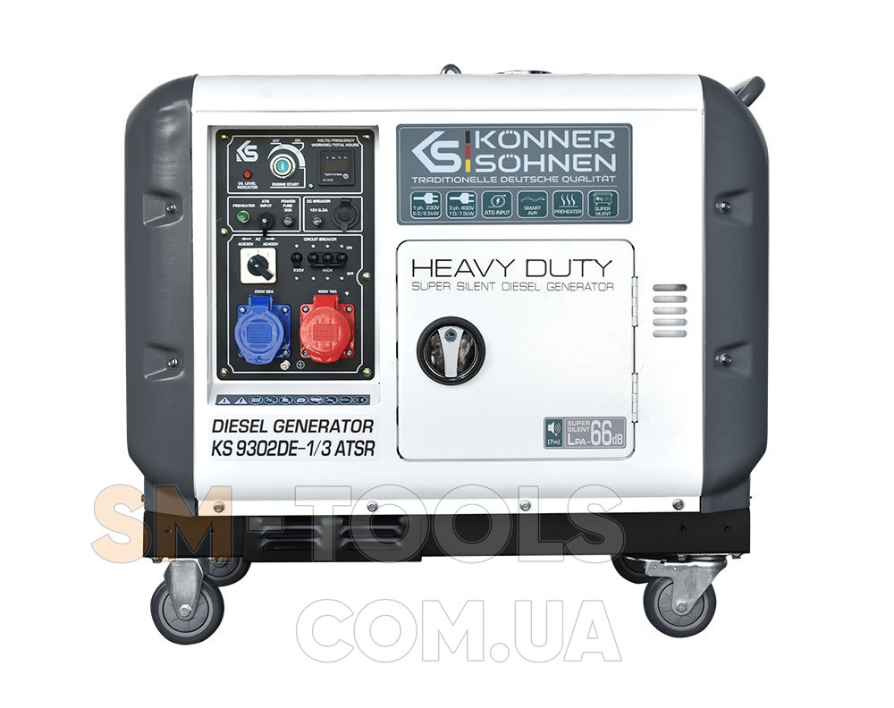 Модель дизельного генератора KS 9302DE-1/3 ATSR серии HEAVY DUTY немецкой торговой марки Könner & Söhnen является отличным выбором как резервный источник питания как среди владельцев частных домов, так и для малых предприятий. Оснащен антивандальным кожухом, что делает эту модель возможной для применения в небольших магазинах, кафе, ресторанах и других заведениях, где требуется аварийный источник питания из-за частых перебоев с электроснабжением.