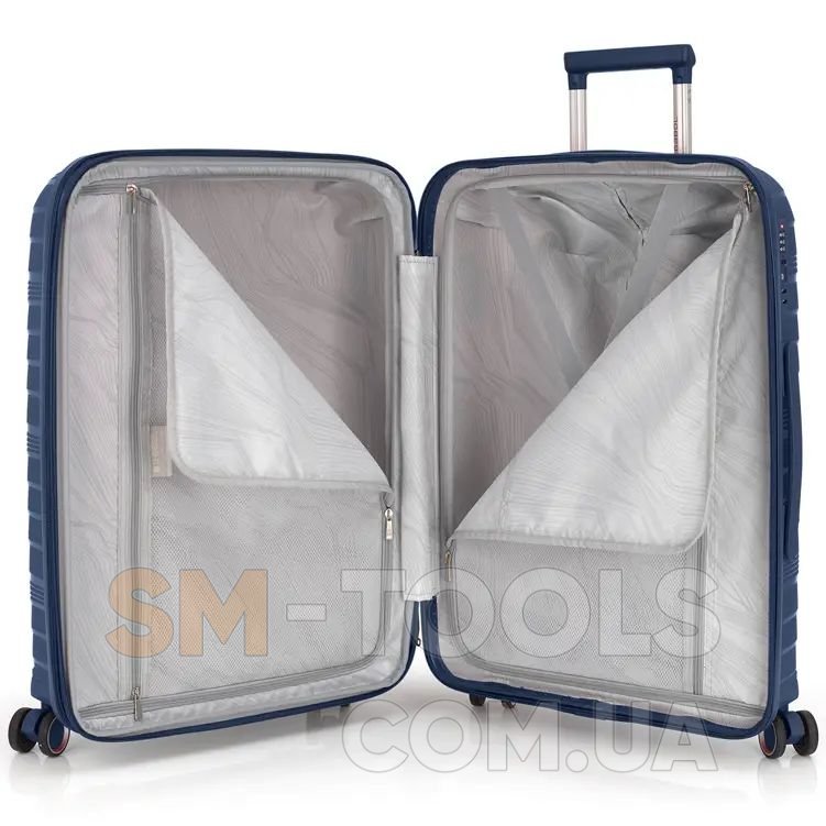 - Чемодан разделен перегородкой на молнии на два основных отделения, перегородка имеет сетчатый карман на молнии.