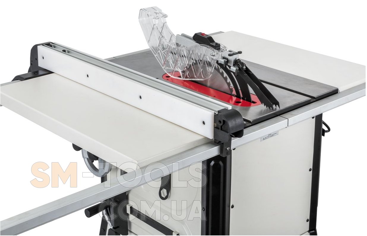 Основа станка – мощный литой из чугуна рабочий стол, к нему прикреплен пильный модуль из этого же материала, содержащий привод диска и механизмы его наклона и погружения. К столу же крепятся стальные из толстого листа расширения слева и справа, а также составляющие направляющие с миллиметровой разметкой. Они дополнительно скрепляют секции рабочей поверхности и служат базой для параллельного упора. Он оснащен удобным эксцентриковым зажимом с двухсторонней фиксацией и обеспечивает быструю, удобную и жесткую настройку ширины реза. Его можно установить как слева, так и справа от диска, а также снять вовсе (для хранения есть кронштейны на корпусе). Для торцовки и распиловки под углом имеется транспортирный упор, скользящий по Т-образному пазу (они с двух сторон диска).