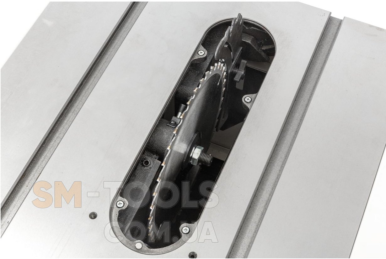 Станок может работать с обычными пильными дисками или с наборными фрезами пазов Dado. Замена оснастки производится сверху после демонтажа вставки. Для упрощения процедуры предусмотрен упругий штифт блокировки шпинделя.