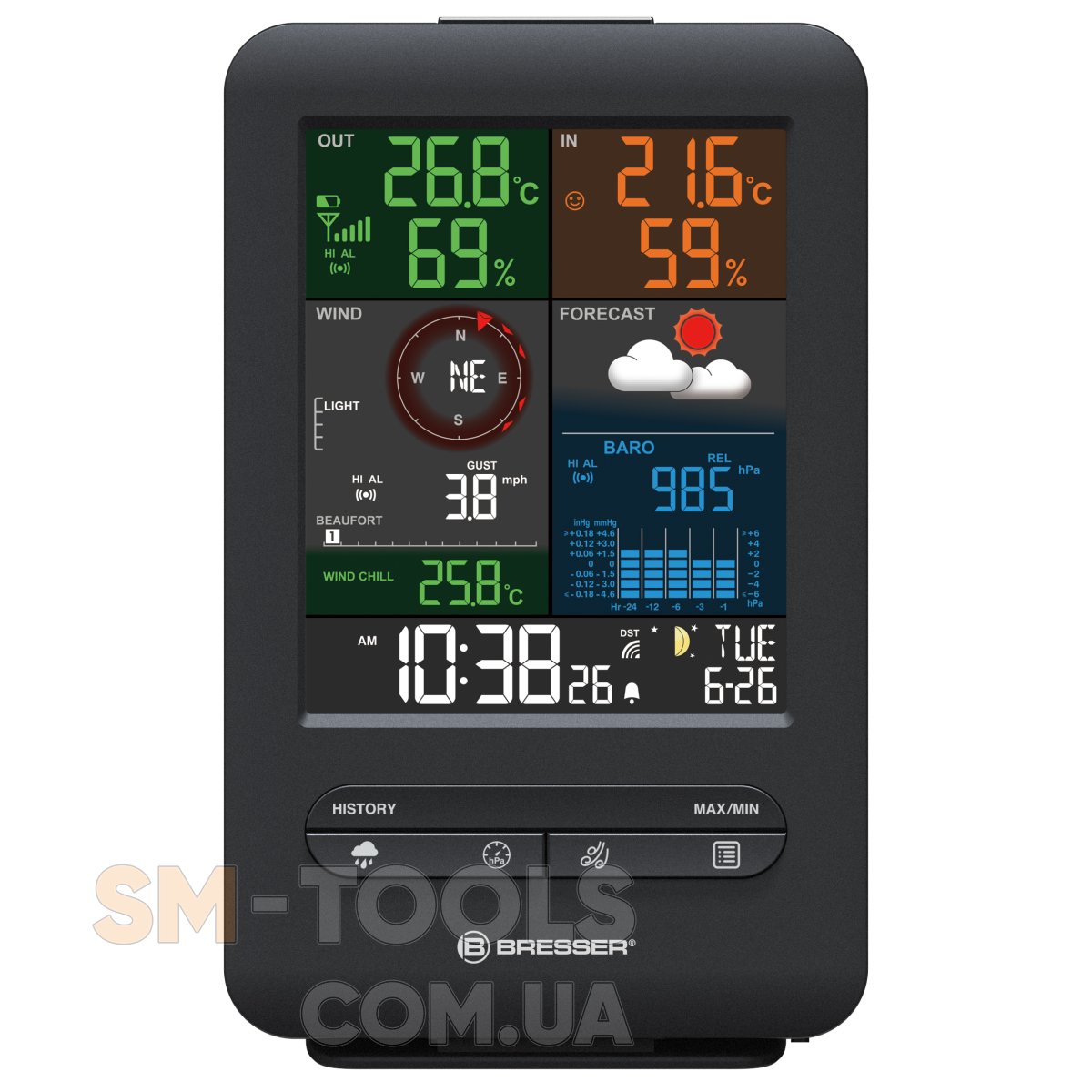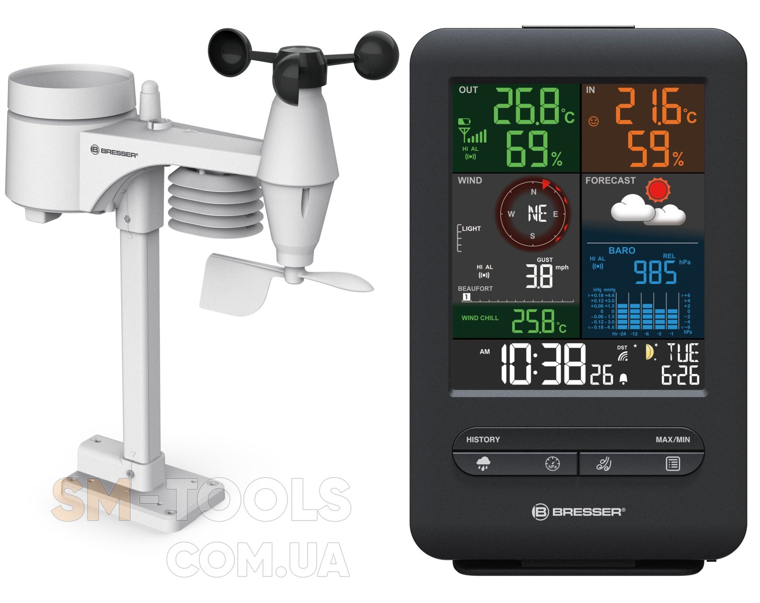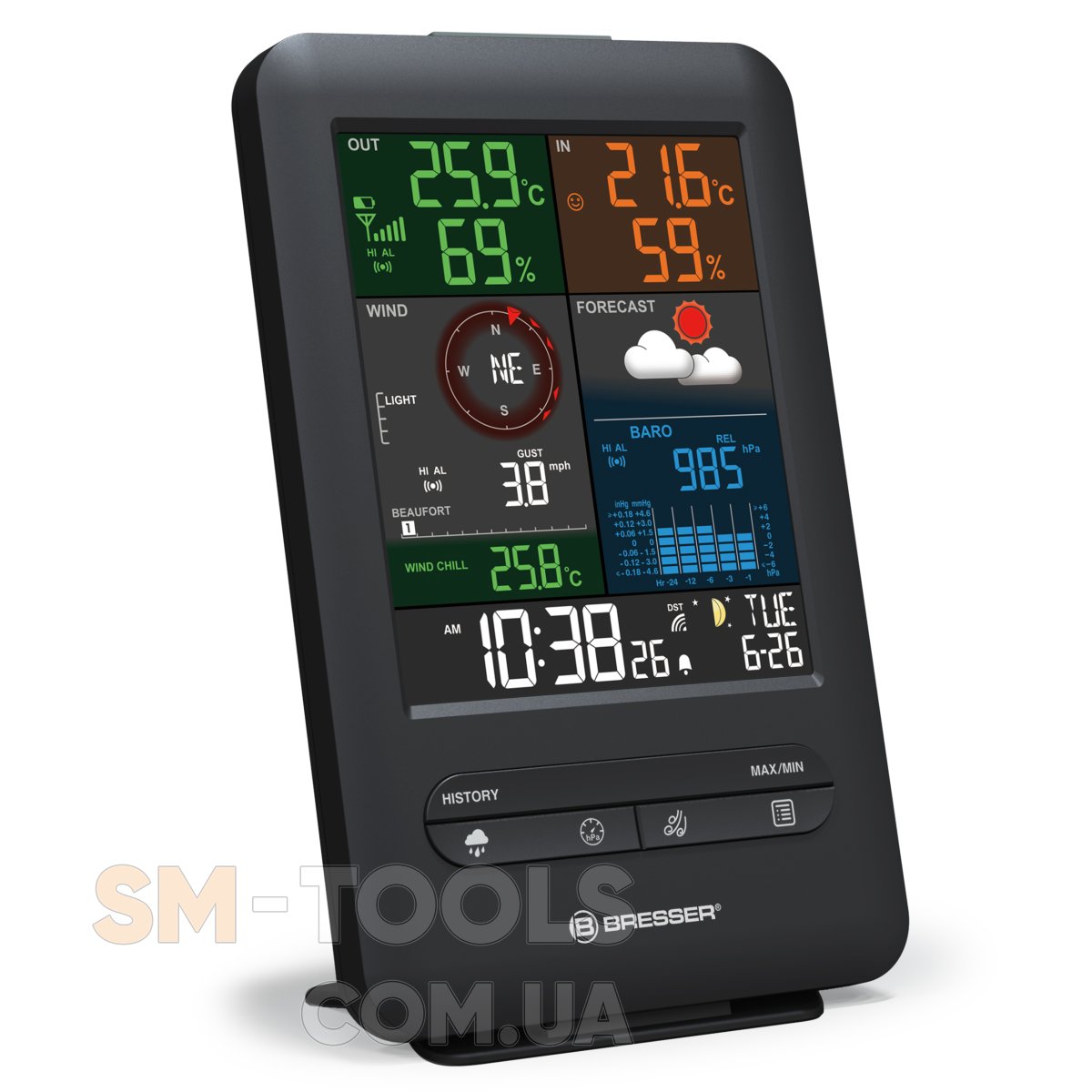 Сучасна метеостанція з прогнозом погоди Bresser Weather Center 5-in-1 Beaufort (7002525) забезпечує вимірювання таких важливих метеопараметрів як величина атмосферного тиску, швидкість та напрям вітру, рівень, опадів, температура та відносна вологість повітря та ще багато інших вимірювань. Вбудована функція тривожних сповіщень попередить вас про вихід вимірюваних параметрів за вказані межі. Усі датчики скомпоновані в єдиному блоці, що значно спрощує та прискорює процес встановлення та монтажу. Унікальний кольоровий дисплей має широкий кут огляду та високий контраст. Сучасний лаконічний дизайн та широкий спектр функцій дозволить з рівним успіхом використовувати цю метеостанцію як у квартирі, так і на присадибних ділянках.