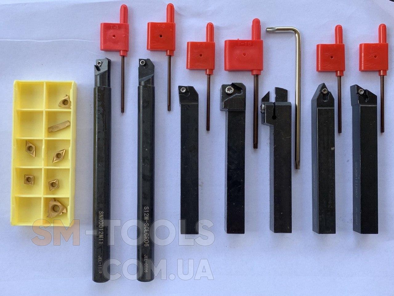 Резцы токарные 12х12 мм 7 шт со сменными твердосплавными пластинами. Резцы хорошего качества и жесткости. Пластины и ключи для смены пластин в комплекте. SDJCR1212H07: 12 x 100 мм SDNCN1212H07: 12 x 100 мм MGEHR1212-2: 12 x 100 мм SER1212H16: 12 x 100 мм SCLCR1212H06: 12 x 100 мм S12M-SCLCR06: 12 x 150 мм SNR0012M11: 12 x 150 мм