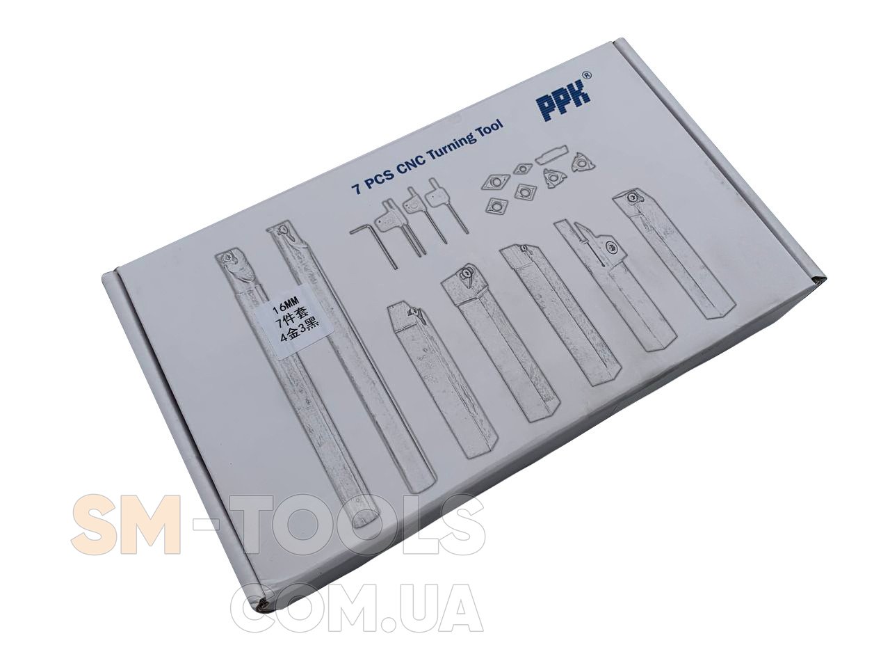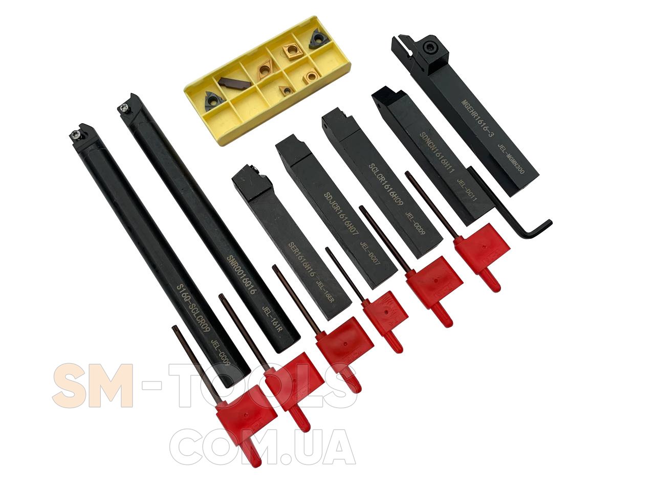 Резцы токарные 16х16 мм 7 шт со сменными твердосплавными пластинами. Резцы хорошего качества и жесткости. Пластины и ключи для смены пластин в комплекте. SDJCR1616H07: 16 x 100 мм + пластина DC07 SDNCN1616H11: 16 x 100 мм + пластина DC11 MGEHR1616-3: 16 x 100 мм + пластина MGMN300 SER1616H16: 16 x 100 мм + пластина 16ER SCLCR1616H09: 16 x 100 мм + пластина CC09 S16Q-SCLCR09: 16 x 180 мм + пластина CC09 SNR0016Q16: 16 x 180 мм + пластина 16IR