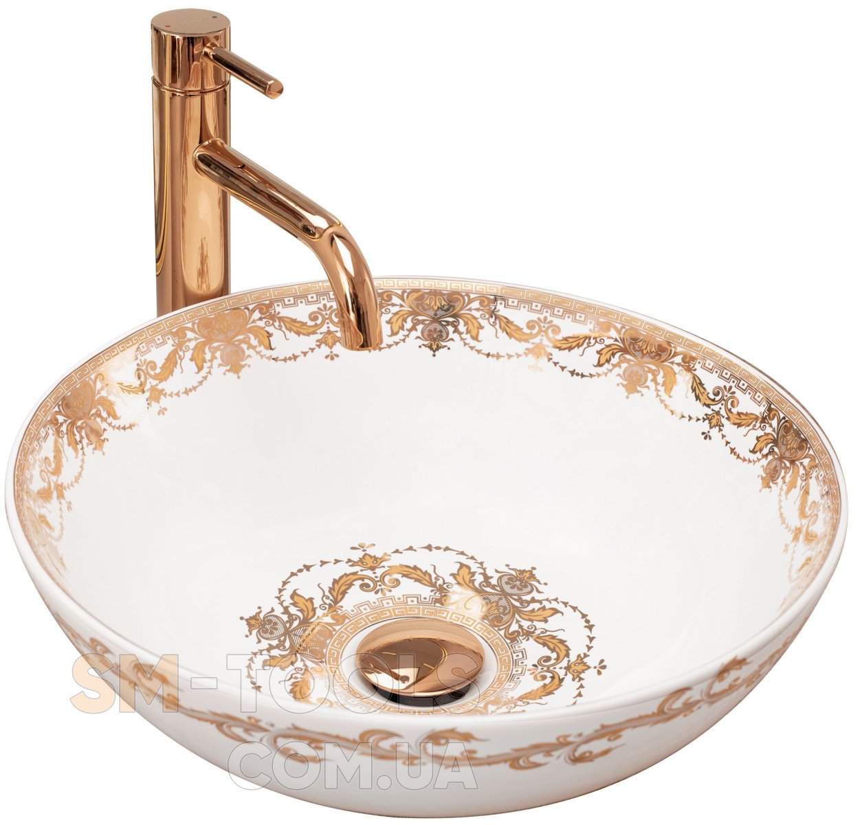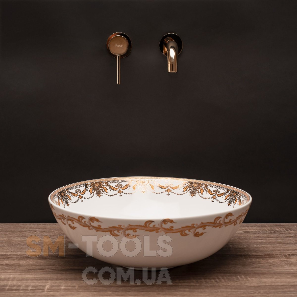Умывальник круглой формы из белой керамики. Глянцевая отделка с золотистым узором придаст классу и украсит интерьер. Это будет работать как практичное решение, все это очень легко содержать в чистоте. Он станет прекрасным дополнением для любителей овальных форм, привнося элегантность в обустройство ванной комнаты дома и в офисе. Благодаря специальной стадии производства он прочный и легко моется.