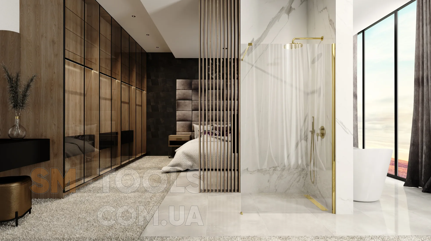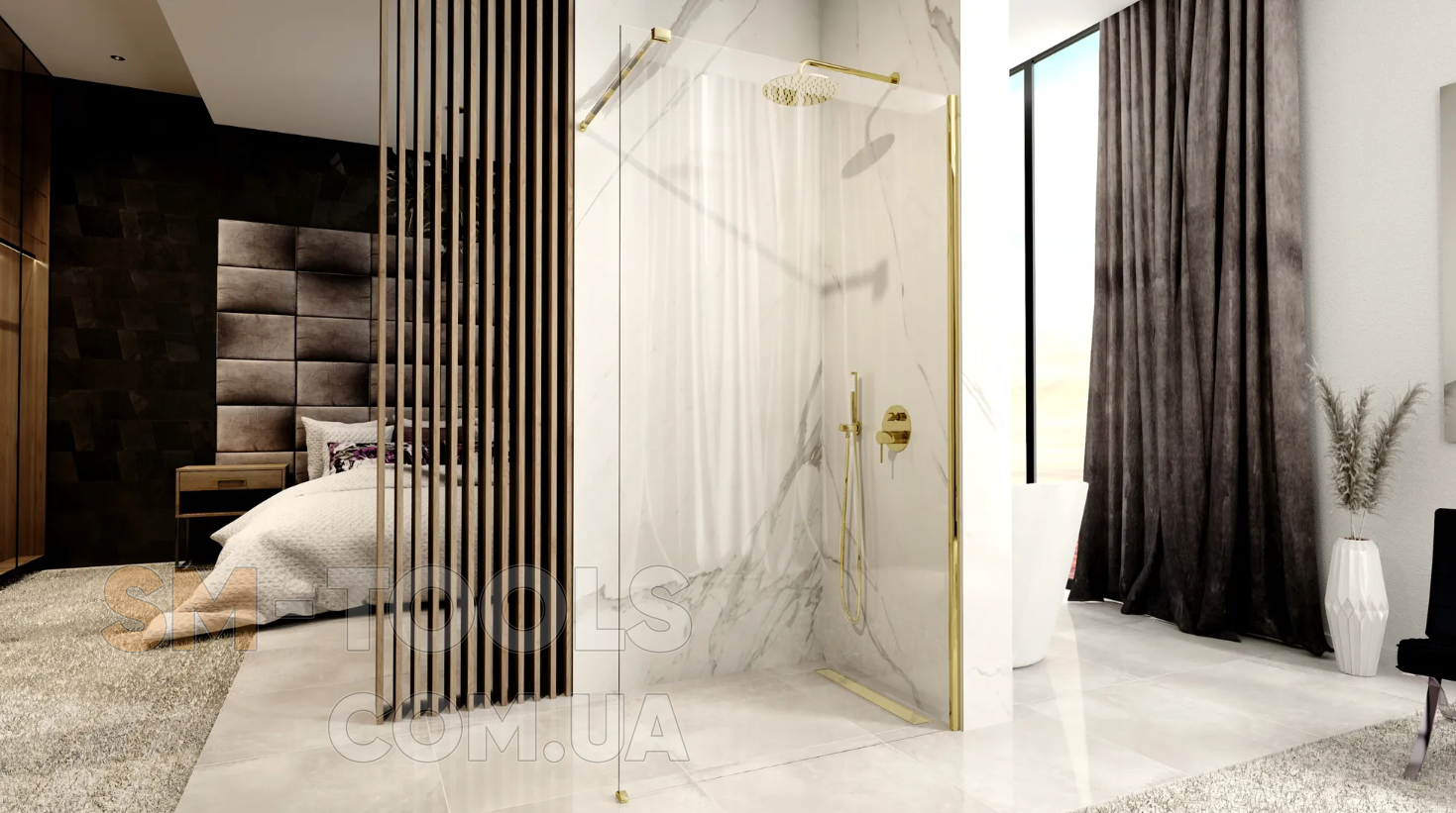 Представляем вам красивую, чрезвычайно функциональную и современную перегородку для душа. Это продукт, который идеально заполнит пространство вашей ванной комнаты, сохранив безупречный внешний вид и эстетику интерьера. Стена приспособлена для установки на душевой поддон или с линейным сливом. Изготовлен из качественного закаленного стекла. Золотые элементы были покрыты лазером с четырехкратным покрытием эмалью высочайшего качества. Благодаря этой технологии алюминиевые элементы стекла защищены от коррозии, потускнения и обесцвечивания. Благодаря специальной стадии производства он прочный и легко моется.