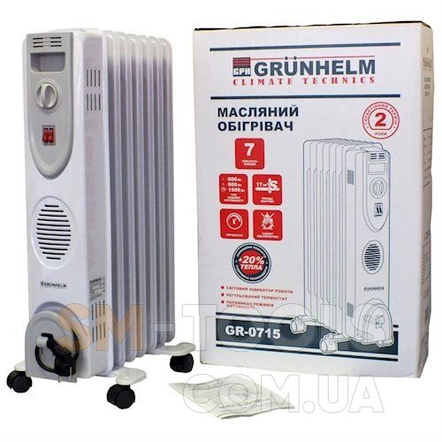 Масляный обогреватель Grunhelm GR-0715 Масляные обогреватели «GRUNHELM» - бытовой электроприбор, служащий для отопления помещений и имеющий промежуточный теплоноситель — минеральное масло. Классическое исполнение масляных радиаторов характеризируется простотой эксплуатации и управления. Современный дизайн и базовое управление делает их наиболее привлекательными и доступными для потребителя. В нашем ассортименте представлены секционные обогреватели — с резервуаром из однотипных секций с общим электрическим нагревательным элементом. Преимущество секционных радиаторов — большая рабочая поверхность, соответственно увеличенная теплоотдача тепла.