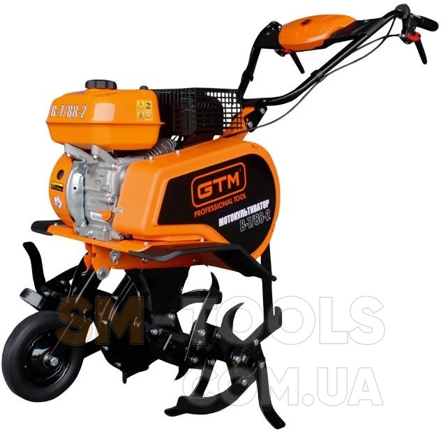 GTM B-7/88-2 - садовая техника бытового класса для обработки земли, вспашки грядок и огородов небольшой площади. Данная модель культиватора оснащена бензиновым двигателем с мощностью 7 л.с (5,2 кВт) с увеличенным крутящим моментом для лучшей работы. Ширину культивации при работе можно регулировать от 350 мм до 880 мм, в зависимости от ширины грядки.