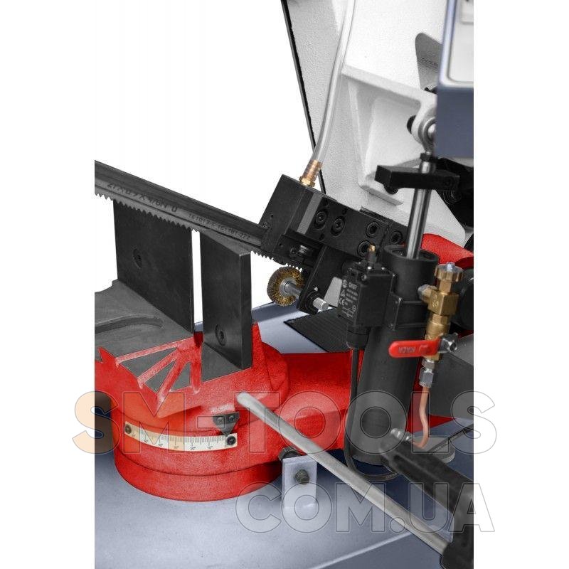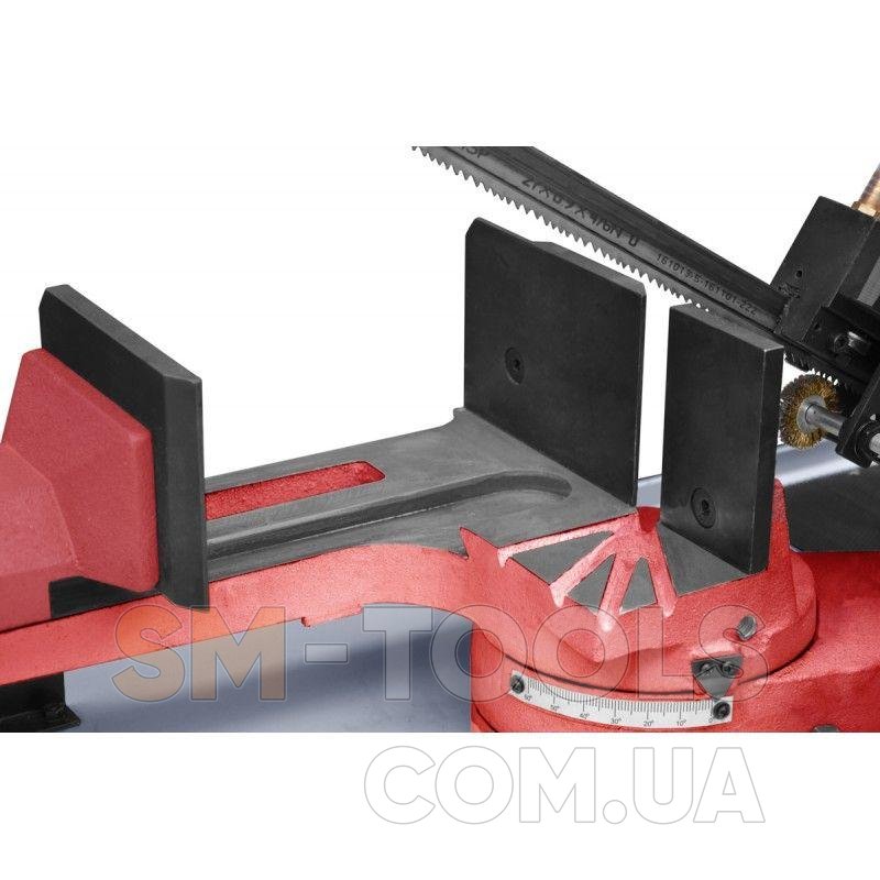 Твердосплавная направляющая значительно снижает износ станка и пильной ленты. Фреза изготовлена из цельного чугуна с режущей лентой шириной 27 мм, используемой в этом резаке. обеспечивает полное выполнение многосерийных резов как профилей, так и твердых материалов. Тиски установлены на регулируемой станине и оснащены быстрозажимным устройством.