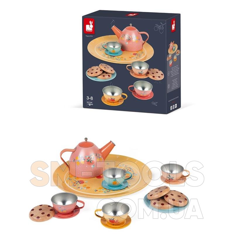 Красиво разрисован детский чайный набор, изготовленный из качественного металла и обязательно станет отличным дополнением к детской кухни. Чайный набор состоит из 14 аксессуаров: 4 металлические тарелки, 4 металлические чашечки, 1 металлический чайник с крышкой, 1 металлический поднос, 1 металлическая тарелка для торта, 4 деревянных печенья, Рекомендуемый возраст: 3+. Размер: 22 х 22 х 2 см.
