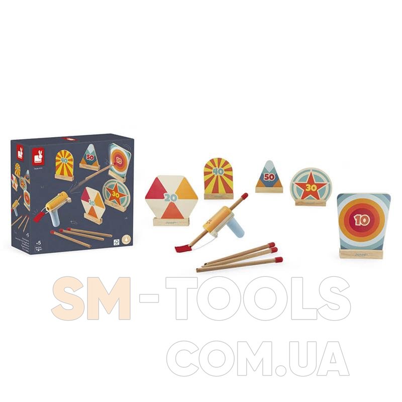 Ярмарок розваг вдома! Цей чудовий тир порадує як дітей, так і батьків, та дозволить добре провести час разом, зі своєю родиною! Цілься... Вогонь! У цій грі ви знайдете 5 кольорових мішеней з підставкою, за яку можна отримати від 10 до 50 очок. Їх потрібно збивати за допомогою пускової установки та 4 дротиків і розташовувати як завгодно та де завгодно! Задня частина дротиків є магнітною, щоб було легше направляти їх, коли вони розташовані в пусковому пристрої. Наконечники виготовлені із силікону для додаткової безпеки. Ця приваблива гра на спритність, яку можна використовувати вдома чи на вулиці, доступна з 5 років і дозволяє дітям розвивати дрібну моторику, спритність та концентрацію уваги. Всі елементи можна зберігати в закритій коробці. Дерев'яна іграшка FSCTM.