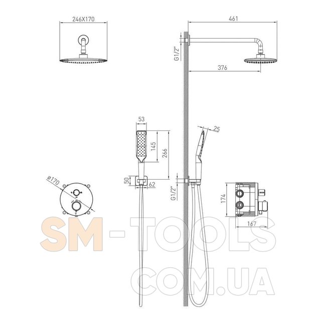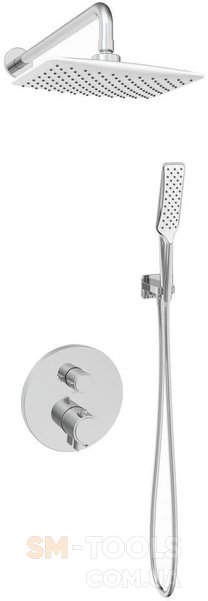 Комплект поставки : смеситель скрытого монтажа, верхний душ с кронштейном, душевой гарнитур, стеновое подсоединение