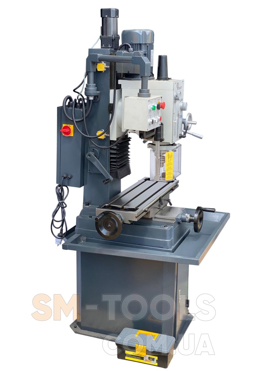 Сверлильно-фрезерный станок 9craft DM45GA 1500W оснащен механической коробкой передач для изменения скорости вращения шпинделя. В данном исполнении поставляется с тумбой. Основным отличием этой модели является автоподача фрезерной головы, что позволяет значительно облегчить и ускорить производственный процесс. Также имеет отдельная подвижная панель управления. Массивная чугунная конструкция в сочетании с закаленными и шлифованными направляющими типа «ласточкин хвост» позволяет осуществлять сверление и фрезерование с высокой точностью и жесткостью. Рабочие поверхности имеют шабрение. Фрезерная голова позволяет изменять угол наклона шпинделя влево и вправо от 0 до 90 градусов для выполнения широкого спектра задач. Рабочий стол большого размера позволяет обрабатывать мало- и крупногабаритные детали. Дополнительно может оснащаться УЦИ, Системой СОЖ, рабочим светом, устройствами автоподачи стола. Форма расчета - наличные, безналичный расчет, оплата на карту, наложенный платеж, рассрочка, кредит от Приватбанка • Автоподача фрезерной головы • 1 год гарантии • Закаленные и шлифованные направляющие • 1500W – мощность двигателя • Асинхронный электродвигатель 220В • Левое/правое вращение шпинделя • 6 скоростей вращения шпинделя в диапазоне 95-1600 об/мин при частоте переменного тока 50 гц. • Аналоговая индикация перемещения пиноли · Шпиндель оснащен механизмом микроподачи • Размер стола 800x240 мм. • 14 мм ширина Т-паза • 560 мм Перемещение по оси X • 230 мм Перемещение по оси Y • 130 мм – ход пиноли • 260 мм расстояние от шпинделя колонны • 470 мм максимальное расстояние от шпинделя до стола • 50 мм минимальное расстояние от шпинделя до стола • 300 мм ход головы • 45 мм максимальный диаметр рассверливания отверстий в стали • 32 мм максимальный диаметр обработки концевой фрезой • 80 мм максимальный диаметр обработки торцевой фрезой • Функция нарезки резьб • +-90 градусов наклон головы • 340/400 кг вес нетто/брутто • MT4 конус шпинделя • Размер упаковки 74x72x108 см • Направляющие закрыты гармошкой Комплектация: · Станок в сборе · Набор инструментов для работы и обслуживания · Конус патрона и сверлильный патрон · ТумбаХарактеристики Сверлильно-фрезерный станок 9craft DM45GA с автоподачей фрезерной головы и тумбой