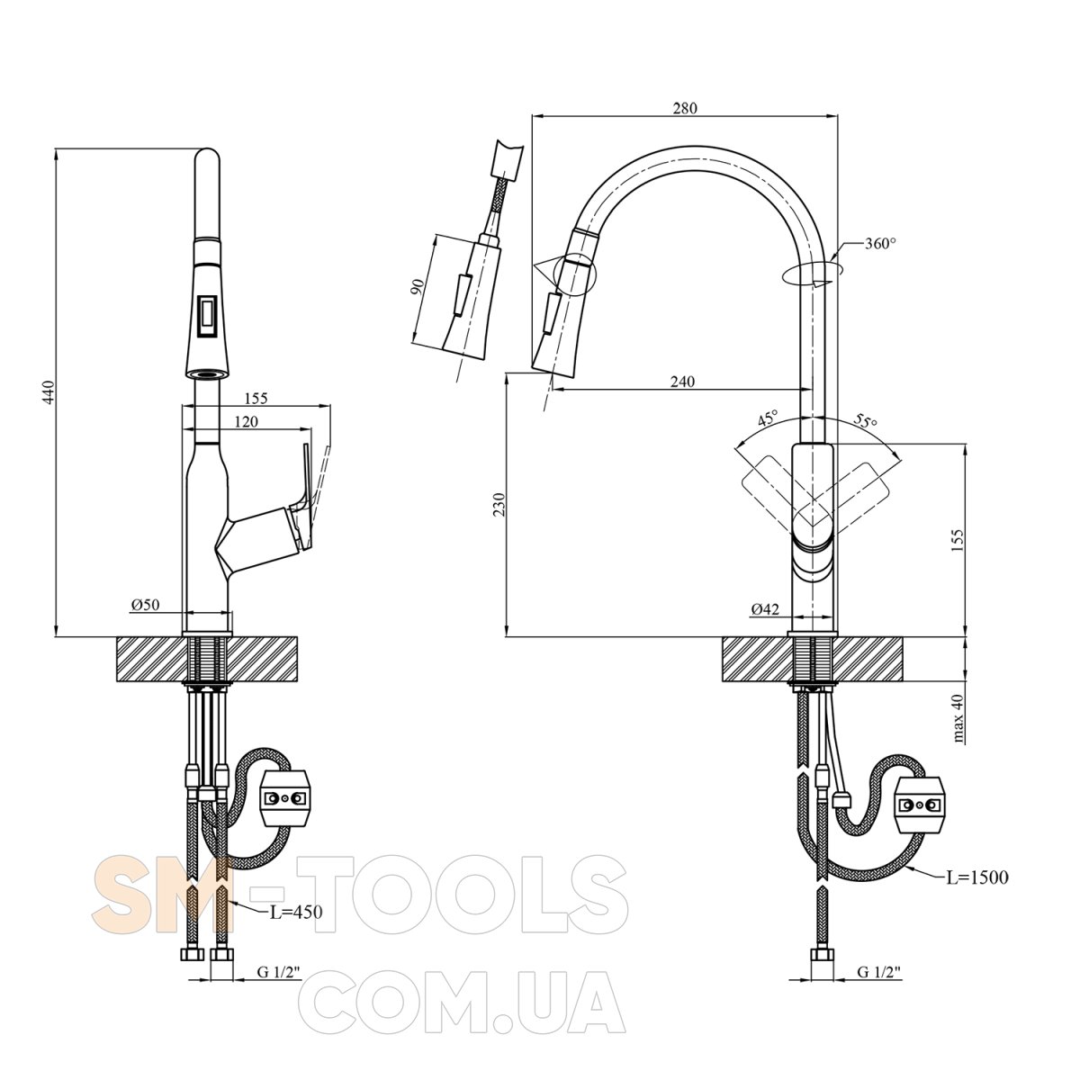 Диаметр подключения шлангов : 1/2''Высота излива, мм : 230Диаметр монтажного отверстия, мм : 35Расход воды, л/мин : До 13Тип излива : Выдвижной/ПоворотныйТип крепления : ГайкаТип подвода : ГибкийВстроенный кран для питьевой воды : НетПредставление питьевой воды : НетУправление подачей питьевой воды : НетФорма излива : U-образнаяВысота, мм : 440