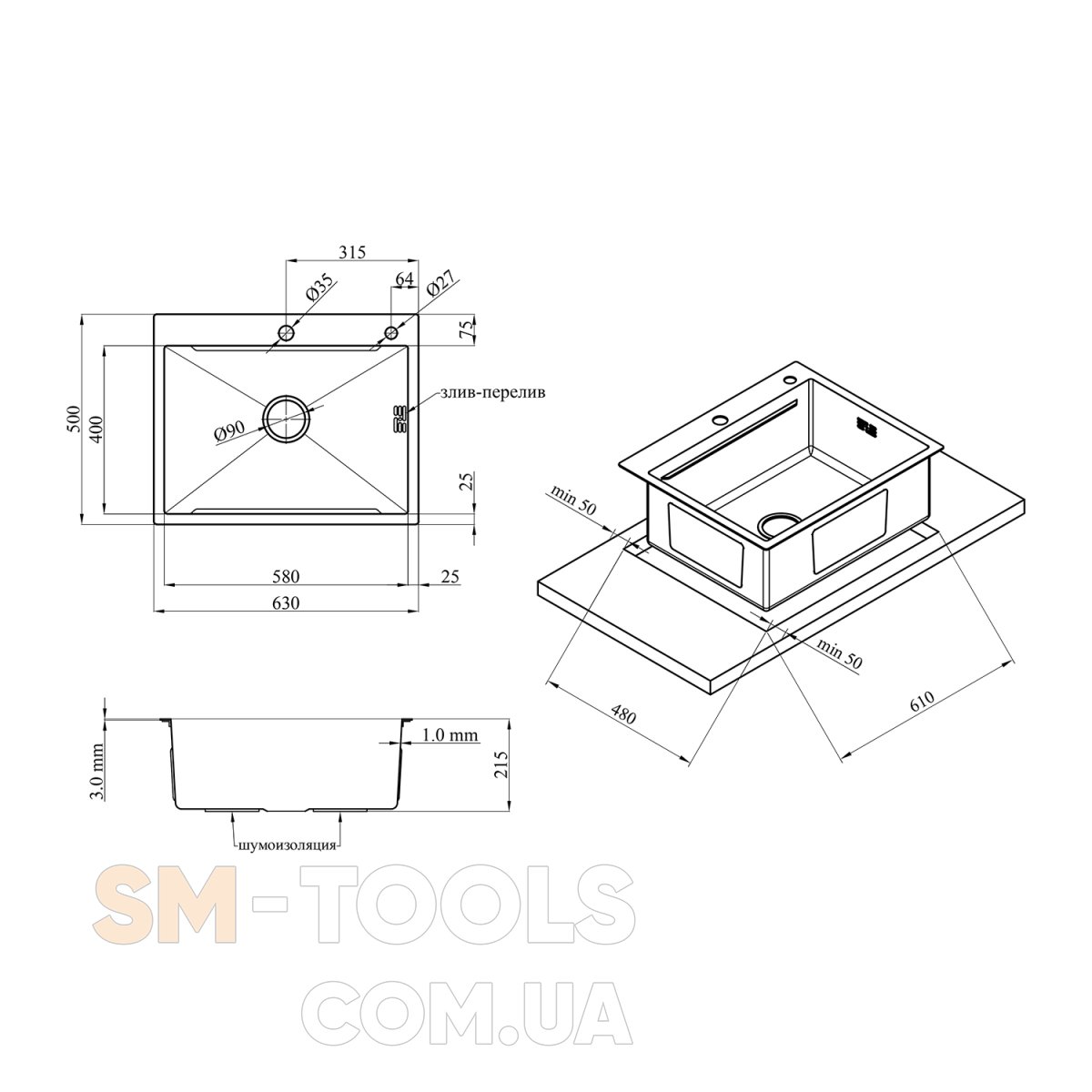 Кухонная мойка Kroner KRP Geberst - 6350HM (3,0/1,0 мм)