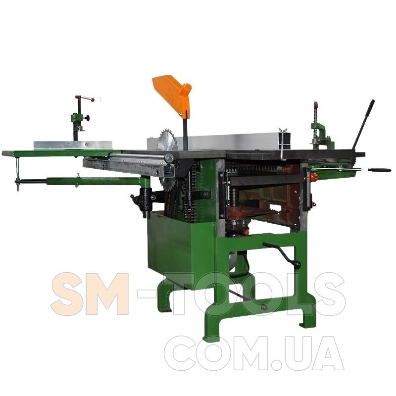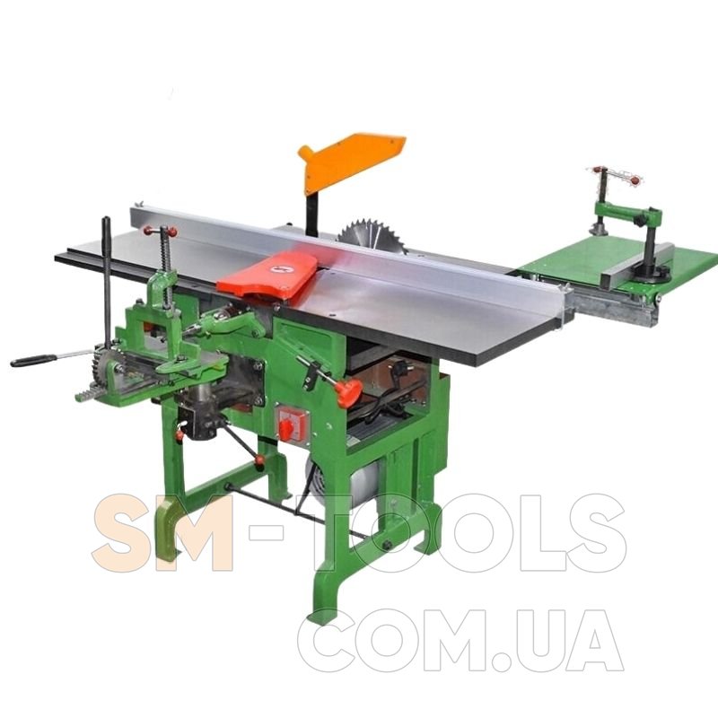 Распил: Двигатель мощностью 3.0 кВт обеспечивает производительную работу с диском 250 мм и ножами 310 х 25 х 3. Глубина пропила составляет максимум 80 мм, но высоту распила можно легко регулировать с помощью поднятия стола. Угол распиловки от 0° до 90° расширит диапазон возможностей. Строгание: Максимально допустимая ширина строгания 300 мм, где 3-х ножевой вал справится с наилучшим образом. При строгании стол обеспечит большую площадь для работы. Фрезерование: Для фрезерования используются специальные дисковые фрезы, они легко ставятся на место пильного диска – достаточно снять защитный кожух и отрегулировать пылеотвод.