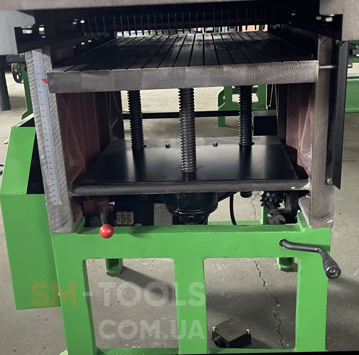 Все рабочие плоскости сделаны из монолитного чугунного сплава и тщательно отшлифованы. На рабочем валу ножи 410 х 25 х 3 размером. Для более безопасной работы в конструкцию включена защитная планка стругального вала. Станок имеет возможность выборки четверти при строгании, а при работе в режиме рейсмусирования заготовка подается автоматически со скоростью 8,5 м/мин.