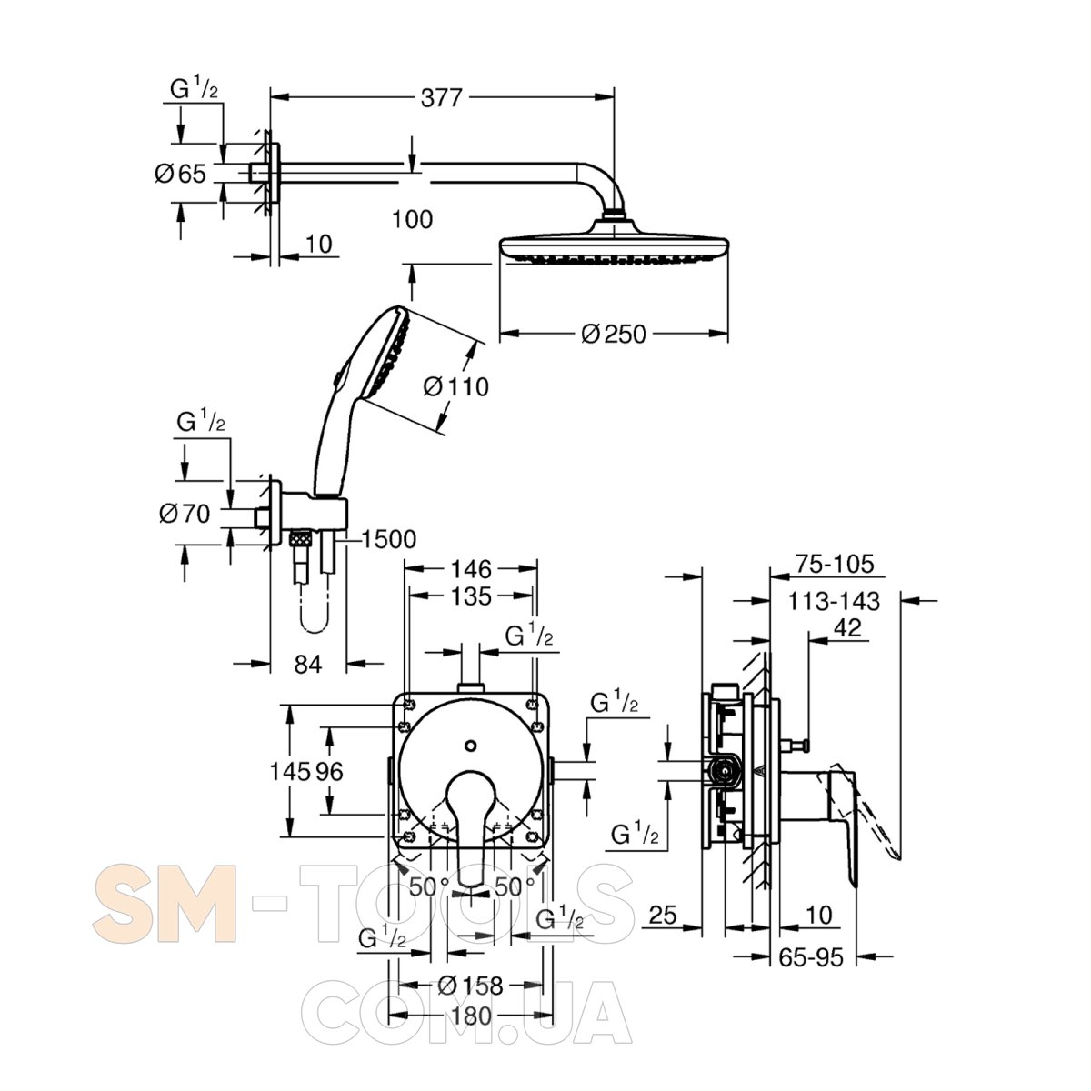 Душевая система скрытого монтажа Grohe QuickFix Start 25292000 - это идеальный комплект для вашей ванной комнаты, объединяющий стиль, удобство и высокую эффективность. Этот комплект включает в себя компактную панель с однорычажным смесителем Start с двухсторонним переключателем в сочетании с универсальной встроенной частью Rapido SmartBox для скрытого монтажа, сочетающих современный дизайн и необычайную функциональность благодаря немецкому мастерству. Долговечный керамический картридж GROHE SilkMove дает возможность наслаждаться плавной регулировкой объема и температуры воды с металлическим рычагом. Верхний душ диаметром 250 мм и кронштейн длиной 380 мм имеют расслабляющий режим GROHE PureRain. Ручной душ 110 мм со шлангом TwistStop длиной 1500 мм предлагает два режима: Jet сфокусированный для мощного мытья, а Rain такой же нежный, как летний дождь. Благодаря инновационному переключателю GROHE SmartSwitch можно переключаться между режимами ручного душа. Технология GROHE DreamSpray обеспечивает равномерный поток воды из каждой форсунки, легко очищаемой с помощью системы SpeedClean. Долговечное покрытие GROHE Long-Life обеспечит безупречный вид на длительное время. Монтаж системы настенной накладки быстр и прост благодаря системе GROHE FastFixation, которая включает систему фиксации, настенные розетки, уплотнители и крепления, гарантируя отсутствие риска протекания. Душевая система скрытого монтажа Grohe QuickFix Start - это стильно, интеллектуально и гарантированно доставляет удовольствие от принятия душа! : Для душаТип управления : ОднорычажныйКоличество режимов струи : Верхний душ: 1. Ручной душ: 2.Способ монтажа : СкрытыйФорма воронки : КруглаяФорма верхнего душа : КруглаяДиаметр верхней воронки, мм : 250Диаметр ручной воронки, мм : 110Длина душевого шланга, мм : 1500Длина кронштейна для верхнего душа, мм : 377 Душевый гарнитур в комплекте : ДаСистема предупреждения искажения шланга : ДаМеханизм смешивания : КартриджТермостат : ДаКоличество потребителей : 2Дополнительные характеристики : Универсальная встроенная часть GROHE Rapido SmartBox 1/2". Ручной душ с 2 режимами струи Rain, Jet.Страна регистрации бренда : ГерманияГарантия : 72 месяцаКомплектация : Смеситель, лейка с кронштейном верхнего душа, лейка с кронштейном для ручного душа, душевой шланг, шланговое подключение, крепление.Дополнительно : Производитель оставляет за собой право вносить изменения в комплектацию и конструкцию неухудшающих качество изделий без предварительного уведомления.Количество грузовых мест : 1Материал : Металл/Пластик (ABS)Цвет : Хром/ЧерныйПоверхность : Глянцевая/МатоваяВес брутто, кг : 6,58<
