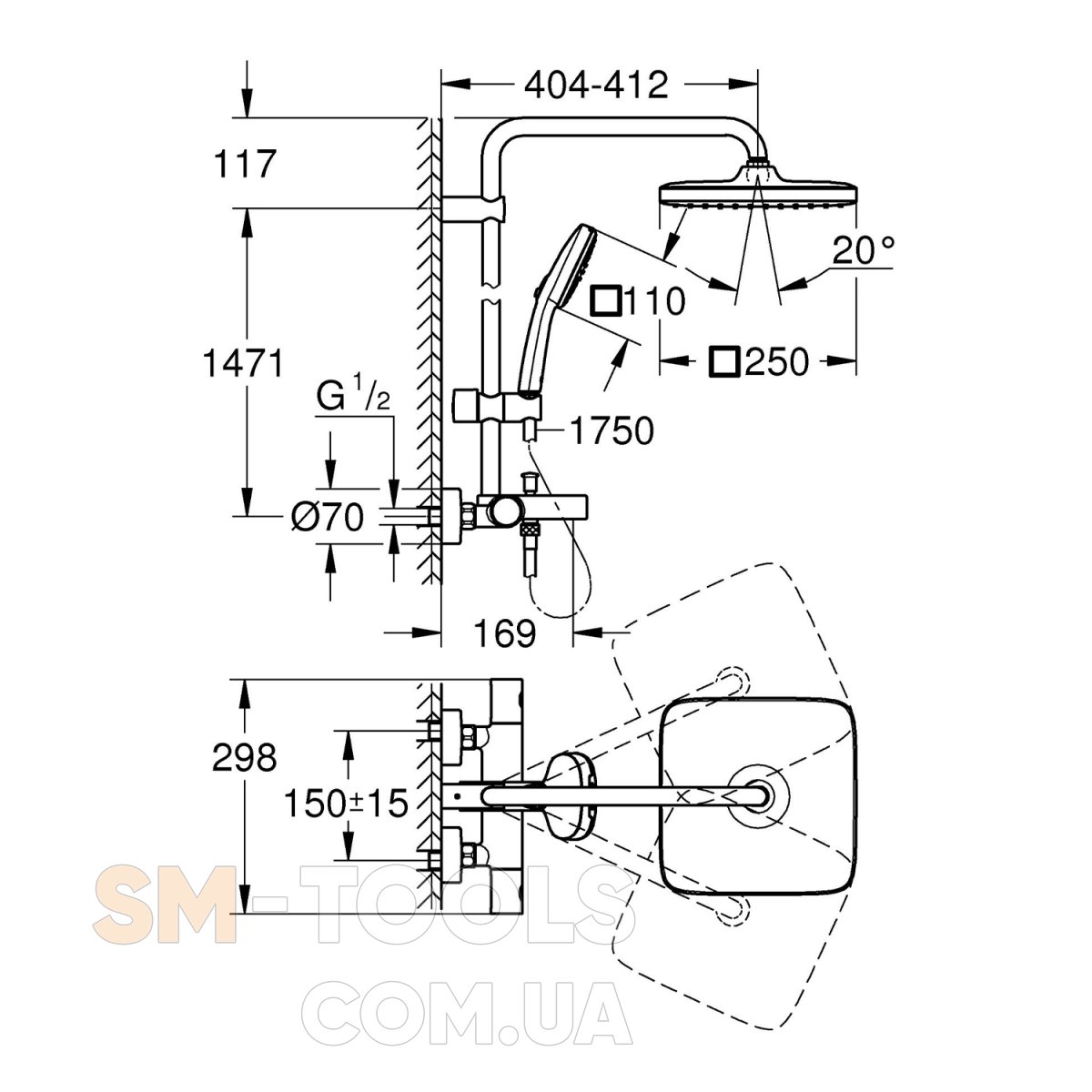 Душевая система термостатическая Grohe QuickFix Vitalio Comfort System 250 26984001 - это комплект, сочетающий в себе стиль, комфорт и передовые технологии. . Система для настенного монтажа включает верхний душ Vitalio Comfort 250, ручной душ Vitalio Comfort 110, термостатический смеситель для ванны, душевую стойку с кронштейном длиной 390 мм и скользящим держателем ручного душа, а также шланг длиной 1750. Верхний душ диаметром 250х250 мм придает мягкую, расслабляющую струю Rain, создавая приятную атмосферу. Ручной душ 110х110 мм имеет силиконовое кольцо ShockProof, обеспечивающее защиту от падений и ударов. Его два режима распыления, мягкий Rain и мощный Jet, позволяют наслаждаться разными вариантами душа. Инновационный переключатель GROHE SmartSwitch позволяет легко управлять режимами ручного душа. Технология GROHE DreamSpray гарантирует равномерный поток воды из каждой форсунки, легко очищаемой благодаря функции SpeedClean. Система обеспечивает постоянную температуру воды благодаря технологии GROHE TurboStat, а технология GROHE Water Saving способствует уменьшению потребления воды и энергии, не повреждая производительность. Для безопасности использования кнопка безопасности GROHE SafeStop установлена на 38°C, предотвращая непреднамеренное повышение температуры. Дополнительный ограничитель GROHE SafeStop Plus может быть установлен на 43°C для дополнительной защиты, особенно в случаях использования детьми. Функция AquaDimmer позволяет удобно переключаться между верхним душем и изливом ванны и регулировать давление воды с помощью одной ручки. Покрытие GROHE Long-Life обеспечивает длительный идеальный вид системы, а благодаря GROHE QuickSpanner термостатический смеситель можно установить без лишних инструментов.Благодаря этой душевой системе вы получите не только высокое качество и эффективность, но и непревзойденный комфорт и удовлетворение от процесса принятия душа. : Vitalio ComfortТип изделия : Душевая системаНазначение : Для душаТип управления : ВентильныйКоличество режимов струи : Верхний душ: 1. Ручной душ: 2. Способ монтажа : НастенныйЦвет : Хром/ЧерныйПоверхность : Глянцевая/МатоваяФорма воронки : КвадратнаяФорма верхнего душа : КвадратнаяВысота, мм : 1623