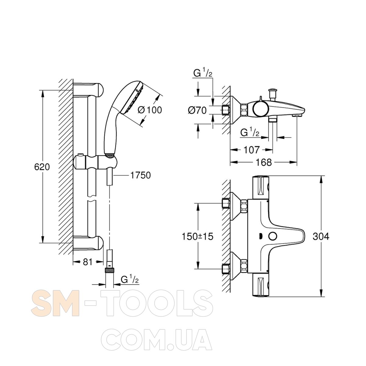 Смеситель для ванной Grohe Grohtherm 800 34567000 с душевым гарнитуром 27853001 (34567001)