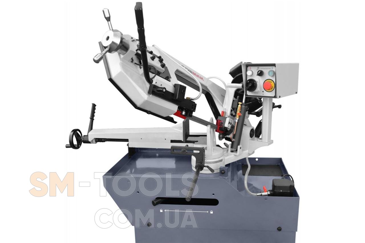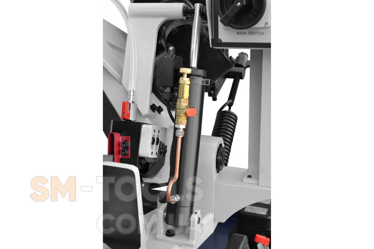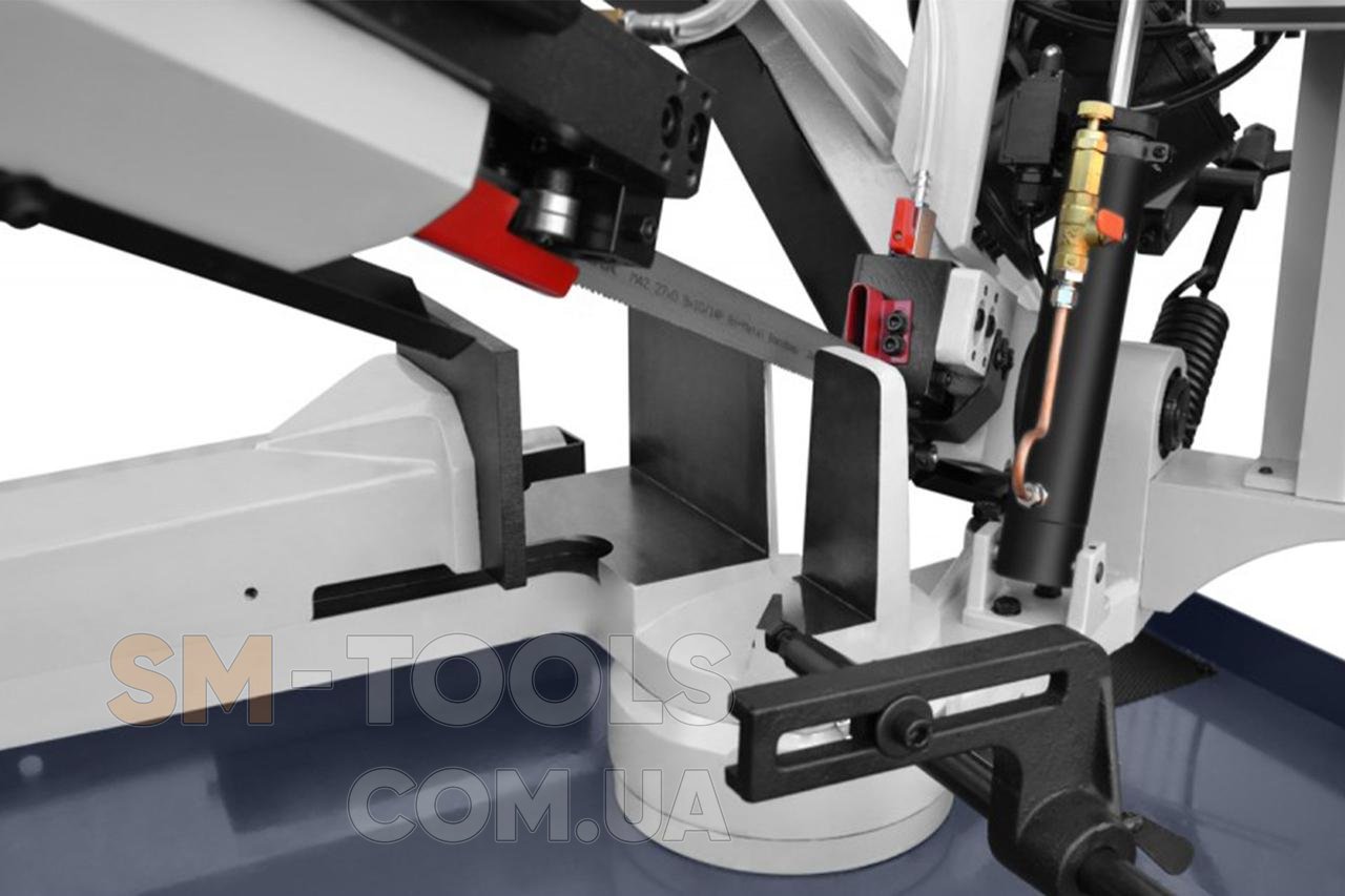 Привод от электродвигателя к колесу, приводящему в движение режущую ленту, передается от двигателя с червячной передаче. Режущая лента натягивается на двух чугунных колесах с помощью ручного натяжителя и направляется по регулируемым роликовым и скользящим твердосплавным направляющим. Внутри отдельный бак охлаждающей жидкости с электронасосом. Скорость опускания стрелы (скорость резания) регулируется гидравлическим приводом.