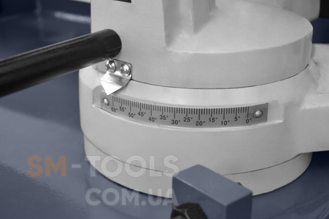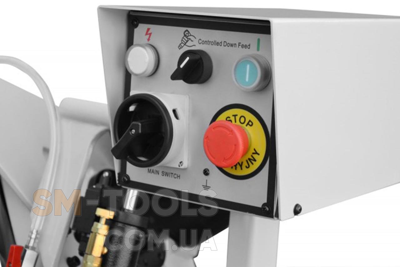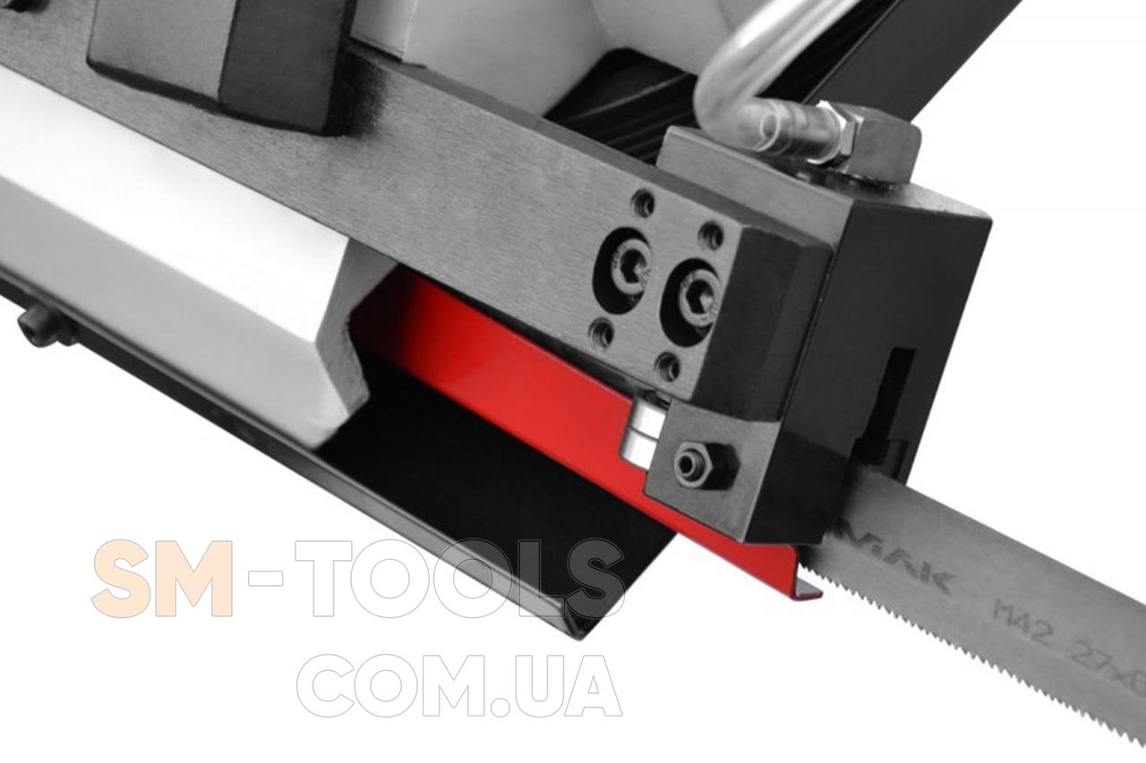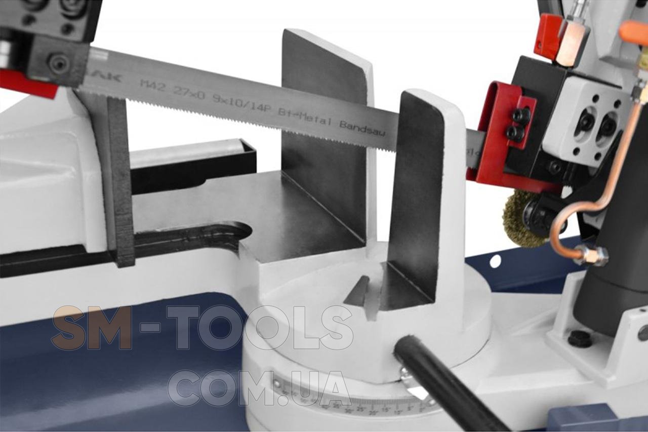 Привод от электродвигателя к колесу, приводящему в движение режущую ленту, передается от двигателя с червячной передаче. Режущая лента натягивается на двух чугунных колесах с помощью ручного натяжителя и направляется по регулируемым роликовым и скользящим твердосплавным направляющим. Внутри отдельный бак охлаждающей жидкости с электронасосом. Скорость опускания стрелы (скорость резания) регулируется гидравлическим приводом.
