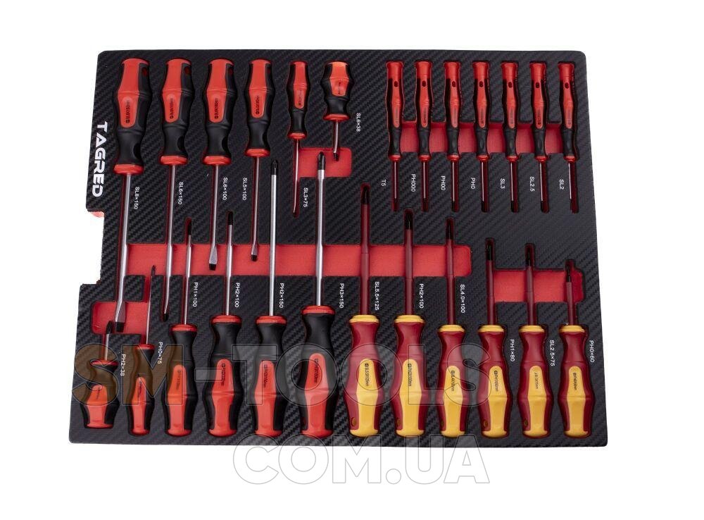 7 шт. прецизионные отвертки: Плоский: (SL2; SL2.5; SL3), Крест: (PH0; PH00; PH000), TORX: (T5) 12 шт. отвертки: Крест: (PH2x38; PH0x75; PH1x100; PH2x150; PH3x150), Плоский: (SL6x38; SL3x75; SL5x100; SL6x100; SL6x150; SL8x150) 6 шт. Изолированные отвертки: Крест: (PH0x60; PH1x80; PH2x100), Плоский: (SL2,5x75; SL4x100; SL5,5x125)4 вставка: