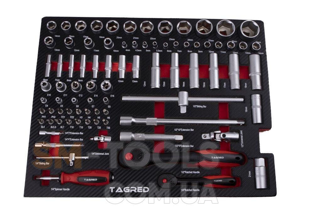 Удлинитель 1/4 (2 шт.: 50 и 100 мм) Карданный шарнир 1/4 и 1/2 Удлинитель 1/2 (шт. 125мм и 250мм) Жесткий гаечный ключ на 1/4 и 1/2 Храповой механизм 1/4 и 1/2 Отвертка Розетки 1/4 (4; 4,5; 5; 5,5; 6; 7; 8; 9; 10; 11; 12; 13; 14 мм) Головки длинные 1/4 (6; 7; 8; 9; 10; 11; 12; 13 мм) Розетки 1/2 (10; 11; 12; 13; 14; 15; 17; 19; 20; 21; 22; 23; 24; 27; 30; 32мм) Головки длинные 1/2 (12; 13; 14; 15; 17; 19 мм) Насадка с ручкой 1/4: Крест: PH1; PH2; PZ1; PZ2 Плоский: SL4; SL5.5; SL7 Шестигранный ключ: H3; H4; H5; H6 Torx: T10; Т15; Т20; Т25; Т30 Свечные гнезда 16 мм и 21 мм Розетка TORX (E4; E5; E6; E7; E8; E10; E11; E12; E14; E16)3 вставка: