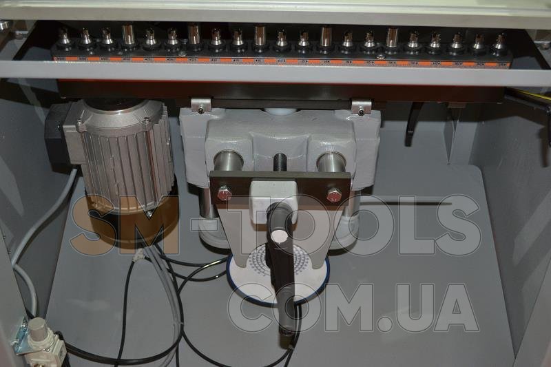 Это стандартный 21 шпиндельный сверлильно-присадочный станок. Расстояние между шпинделями 32 миллиметра, а между первым и последним 640 миллиметров. Вращаются они со скоростью 2850 оборотов в минуту. Пневматическое сверление можно регулировать по скорости, также предусмотрено вращение головки от 90 до 0 градусов.