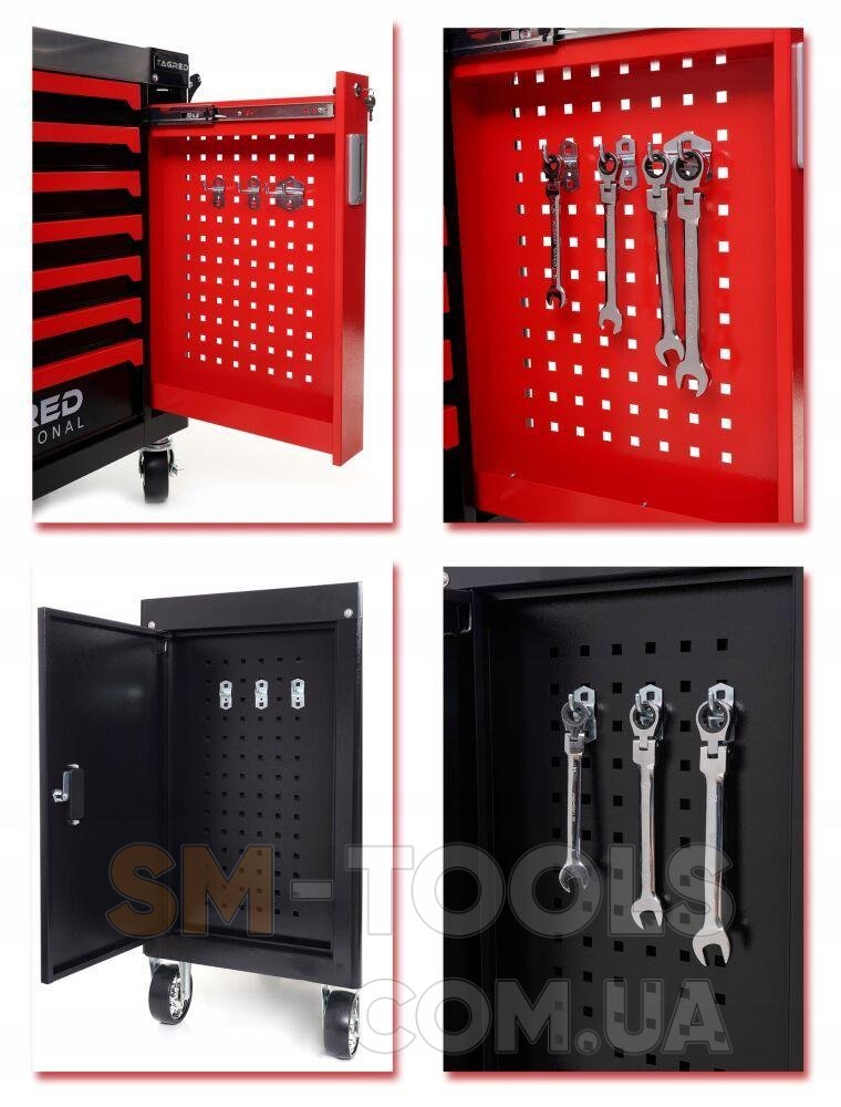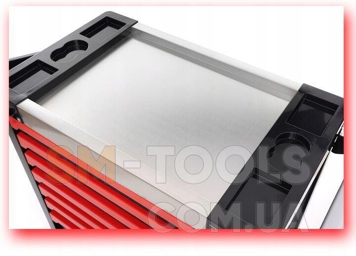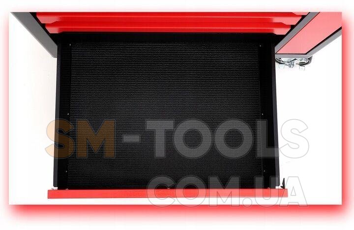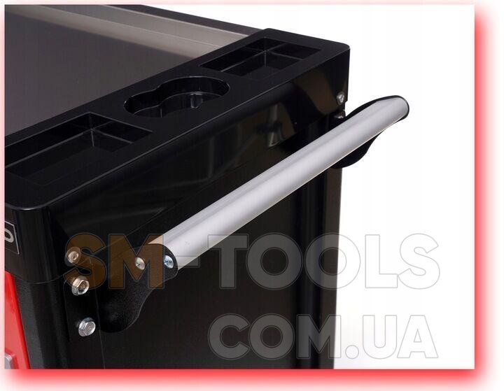 Дополнительные функции для удобства: Конструкция включает в себя практические детали, такие как возможность установки тисков или дополнительных держателей для полотенец или химических средств. Покрытие ящиков из EVA повышает долговечность и защиту инструментов. Два практичных отделения для хранения дополнительных инструментов.