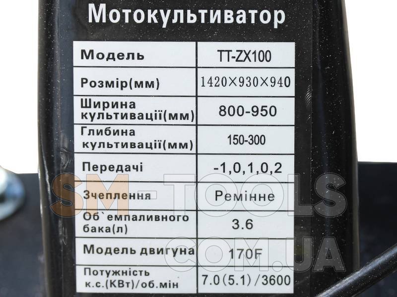 Мотоблок TT-ZX100 TATA (редуктор), колесо 3,5 *6, двигатель 170F (7 л.с.) – эффективное сельскохозяйственное оборудование для выполнения различных задач на приусадебных участках, садах или огородах. Модель оснащена редуктором, колесами размером 3,5*6 дюймов и 7-л.с. силовым агрегатом 170F, работающим на бензине. Преимущества мотоблока TT-ZX100: Мощный двигатель: Двигатель мощностью 7 л.с. обеспечивает достаточно высокий крутящий момент, что делает мотоблок способным справляться с разнообразными условиями работы и задачами. Редуктор: позволяет эффективно использовать возможности силовой установки без потери мощности. Это делает его универсальным инструментом для обработки почвы, обработки, вспашки и других задач. Колеса с высоким профилем: Колеса размером 3,5*6 дюймов имеют прочный и почвозацепистый протектор, что позволяет мотоблоку хорошо руководствоваться на разных поверхностях, включая неровности и мягкую почву. Цельнолитые пластиковые шины не боятся проколов и служат длительное время без износа и повреждений. li> Разнообразие применения: Мотоблок позволяет подключать различные сельскохозяйственные и садовые устройства, такие как плуги, культиваторы, окучители и другие, что делает его универсальным помощником на земельном участке. Эффективность и производительность: Благодаря сочетанию мощного двигателя, редуктора и подключаемых инструментов мотоблок способствует увеличению производительности работ на участке и сокращению времени, затрачиваемого на обработку грунта. Надежность и долговечность: Высококачественные материалы и тщательное производство обеспечивают надежность и длительный срок службы мотоблока. С мотоблоком TT-ZX100 вы получаете универсальное сельскохозяйственное оборудование, готовое к выполнению различных задач на земельном участке. Устройство сейчас находится на нашем складе в Украине и готово к отправке!Категория : МотоблокМодель : TT-ZX100Тип топлива : БензинОхлаждение двигателя : ВоздушноеТип запуска : Ручной стартерМощность двигателя, л.с. : 7Марка двигателя : 170FТактность двигателя : ЧетырехтактныйГлубина обработки, мм : 150 – 300Ворот двигателя, об/мин : 3600Объем топливного бака, л : 3.6Габариты (ВхШхГ), см : 14.2*9.3*9.4Количество передач : 2 вперед, 1 назадШирина обработки, мм : 800-950Тип техники : Редукторный Объем двигателя, см? : 212Расход топлива, г/кВт*ч : 365Производительность, Га/ч : 0.2 – 0.5Глубина обработки, см : 15 - 30Регулировка руля : Регулировка руля вверх/вниз на 135°Рабочая скорость фрезерования, км/ч. : 1.2Объем смазки, л : 0.7Воздушный фильтр : Инерционно-масляного типаСистема смазки : РазбрызгиваниеГабариты (ВхШхГ), см : 14.2*9.3*9.4< /