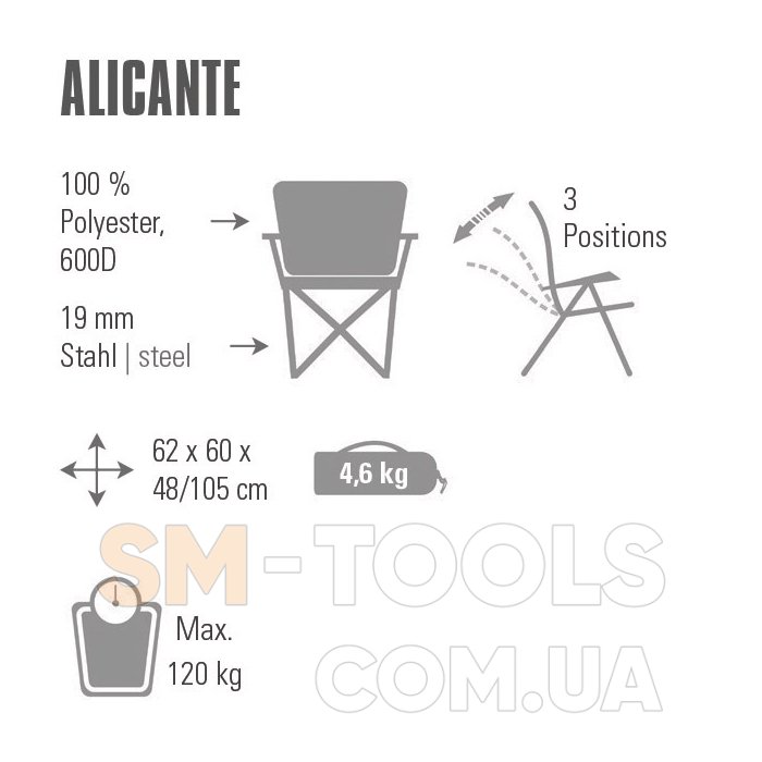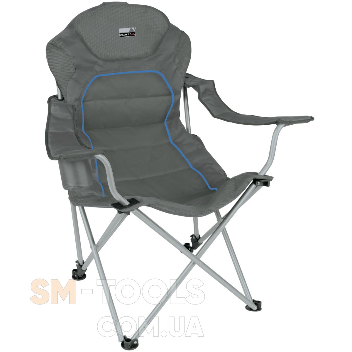 High Peak Alicante Dark Grey/Blue (44117) - комфортный раскладной стул с регулируемой в трех положениях спинкой, м& #39;каким сиденьем и съемным подголовником. Прочная стальная рама с порошковым покрытием выдерживает нагрузку до 120 кг. Износостойкая качественная ткань из полиэстера обеспечивает длительную эксплуатацию. В сложенном виде стул достаточно компактный, поставляется с практичным чехлом для хранения.