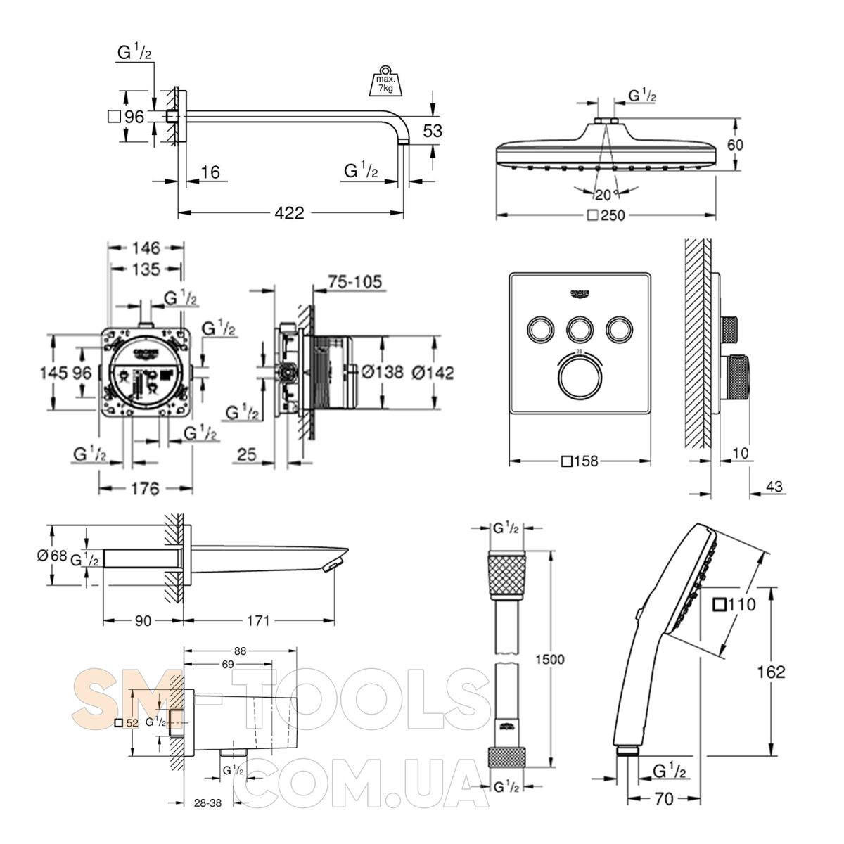 - Комплектуется верхней монтажной частью для GROHE Rapido SmartBox 35600000.