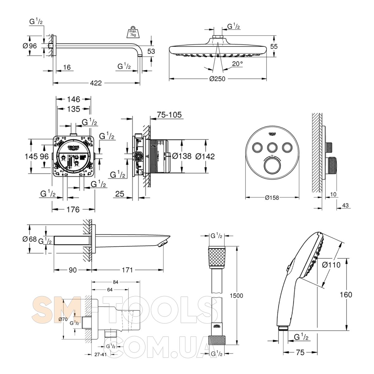 - Комплектуется верхней монтажной частью для GROHE Rapido SmartBox 35600000.