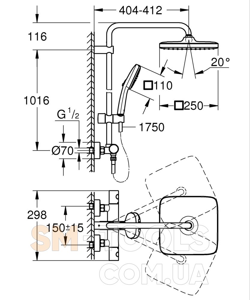 Описание Душевая система с термостатом для настенного монтажа Grohe Tempesta System 250 Cube (26689001)