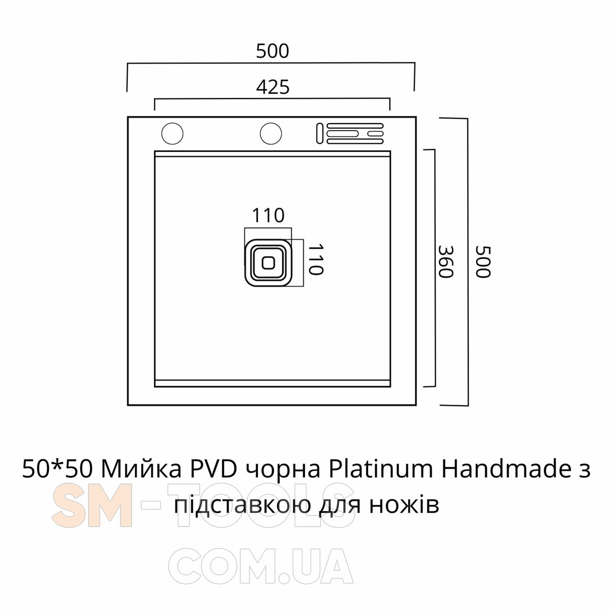 Характеристики Кухонная мойка 50*50 PVD черная Platinum Handmade с подставкой для ножей