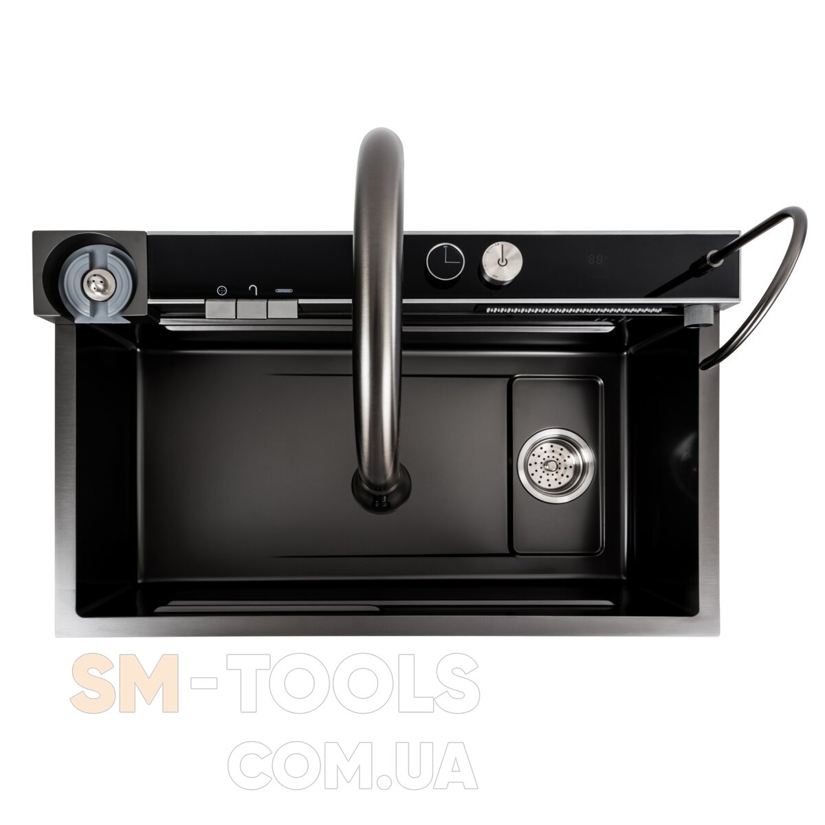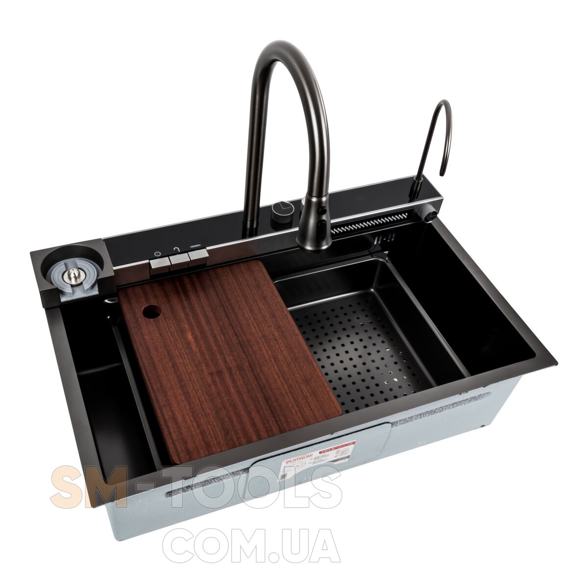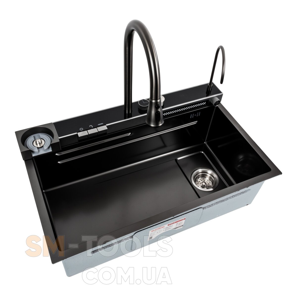 Кухонная мойка 75*45 PVD черная Platinum Handmade "ВОДОСПАД" - невероятно популярная кухонная мойка, настоящее открытие! Ее многофункциональность и комплектация со смесителем делают ее незаменимым аксессуаром для любой кухни. Мы представляем вам кухонную мойку Platinum, изготовленную из высококачественной нержавеющей стали марки SS 201. Эта мойка относится к премиум-сегменту и предназначена для эксклюзивных кухонь.