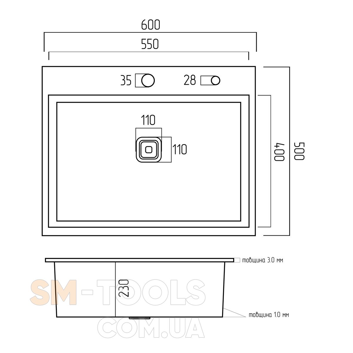 Мойка имеет чашу глубиной 230 мм , что обеспечивает удобство повседневного использования. Тип установки – универсален, как на столешницу, так и под столешницу. Диаметр чаши мойки 550х400х230мм.Для монтажа мойки требуется ширина столешницы не менее 500 мм.
