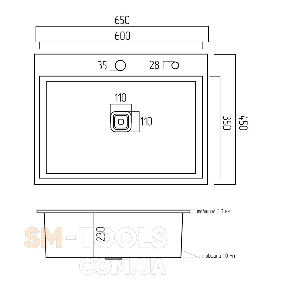 Описание Мойка Platinum Handmade HSB 650х450х230 нержавейка (квадратный сифон 3,0/1,0)
