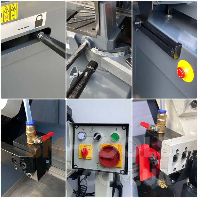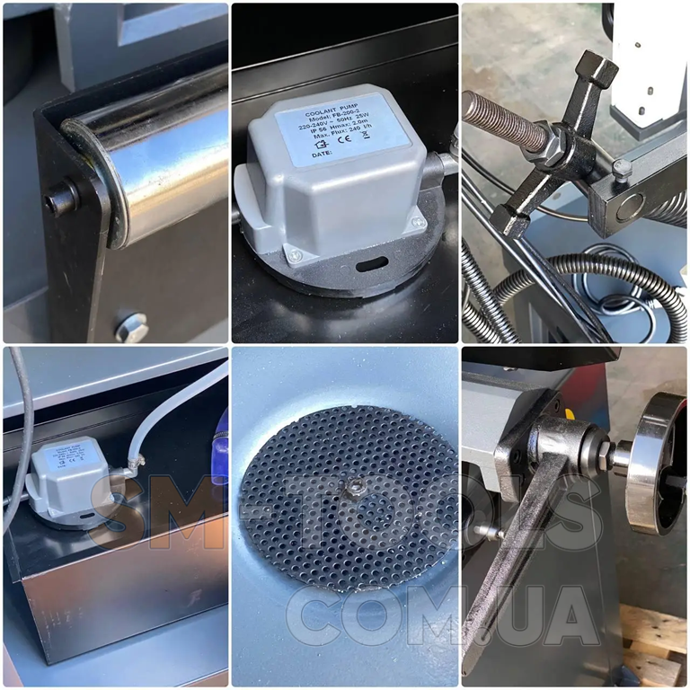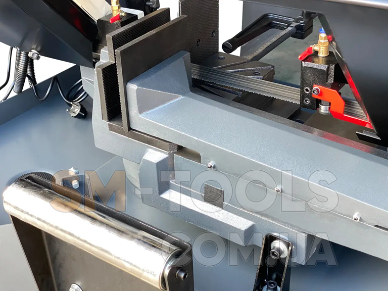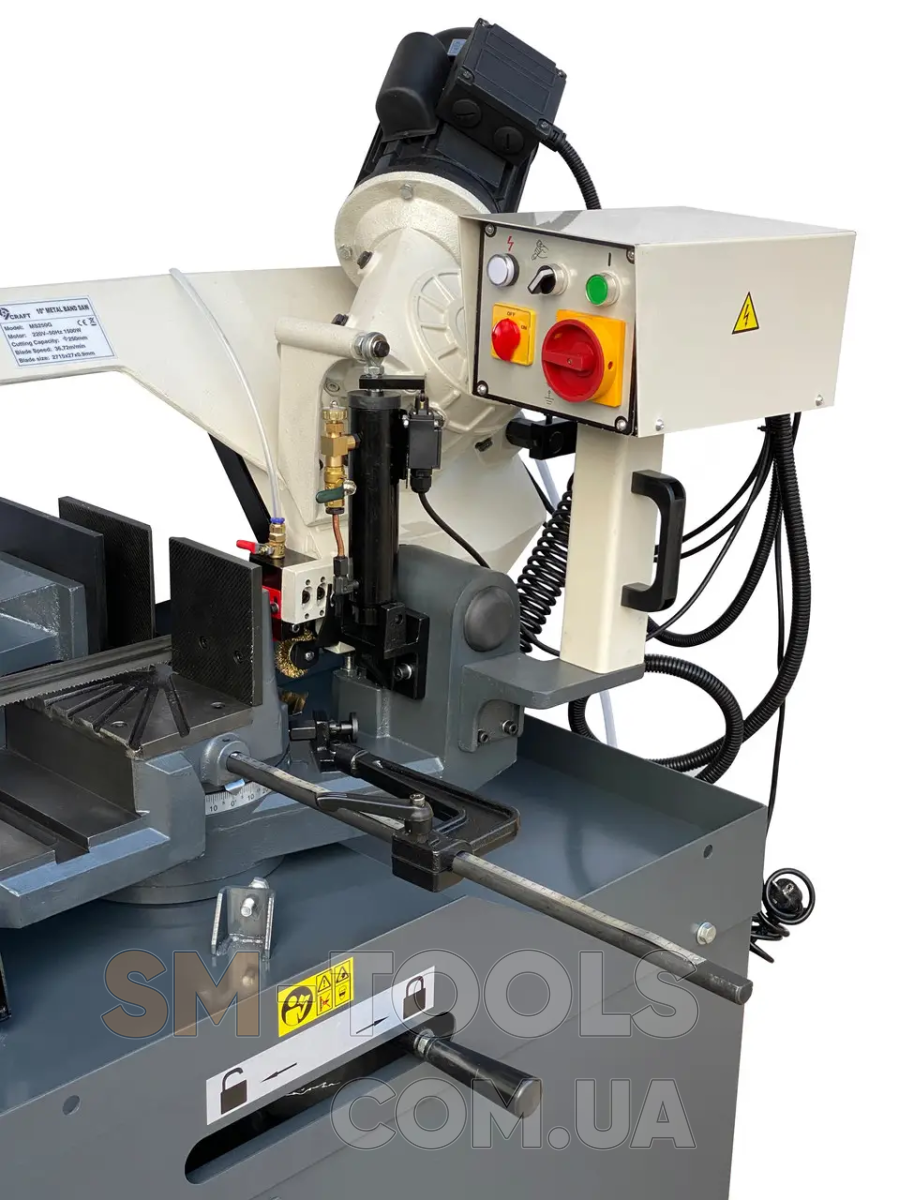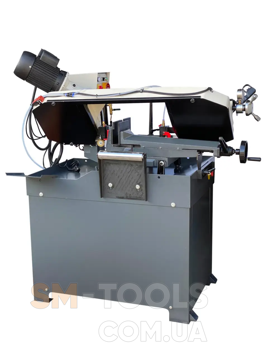 Пила ленточная по металлу 9craft MS250G 1500W 380В. Ленточная пилка по металлу 9craft MS250G оснащена тумбой с системой подачи смазочно-охлаждающей жидкости. СОЖ имеет 2 выхода и подается в зону реза и после него. Система подачи СОЖ позволяет продлить срок службы полотна и упростить процесс резки. Пильная рама имеет гидроцилиндр с блокировкой и регулировкой скорости опускания. После окончания резки концевой выключатель останавливает станок. Пильное полотно имеет индикатор силы натяжения с концевым выключателем, который остановит станок при ослаблении полотна и позволит избежать повреждения. Холст имеет направляющие ролики, а также щетку для очистки полотна от стружки. Редуктор механический. Станок 9craft MS250G имеет 2 режима резки – ручной и автоматический. На этом станке установлены быстрозажимные тиски, а также боковой металлический ролик для удобства подачи заготовки. 9craft MS250G 1500W имеет цельнолитую массивную чугунную раму. Этот станок поставляется в комплекте с пильным полотном.