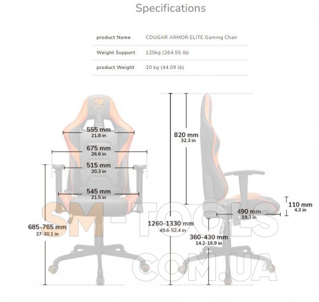 Играйте усерднее и дольше в полном комфорте с Armor Elite. Стабильное, эргономичное и регулируемое (включая наклон на 160? и регулировку по высоте). [Посібник користувача](https://cougar-ukraine.com/media/download/ARMOR_Elite.pdf) ## Непревзойденный комфорт COUGAR Armor Elite обеспечивает комфорт и стабильность, которые вам необходимы, чтобы оставаться расслабленным и здоровым во время долгих игровых сессий. Полностью регулируемые и изготовленные из материалов высочайшего качества, Armor Elite являются примером отличительного дизайна COUGAR, который стал синонимом страсти к играм. Armor Elite изготовлен из экокожи, которая пропускает воздух, чтобы вы оставались свежими и чувствовали себя комфортно. В комплект Armor Elite входят две подушки для головы и поясницы. Отсутствие физического напряжения позволяет полностью сосредоточиться на игре. [img_1606124-01] ## Регулируемый дизайн - Регулировка высоты. Легко отрегулируйте высоту с помощью высококачественного газлифта. - Откидывание спинки до 160?. Наклоняйте от 90 до 160 градусов. Гибко и удобно для поддержания желаемой осанки. Сидите прямо во время работы или игр и ложитесь для отдыха. - Наклон с сопротивлением. Не стесняйтесь откидывать кресло под любым углом без каких-либо ограничений, настраивая сопротивление ручкой регулировки, или же вовсе заблокируйте наклон. [img_1606124-02] ## Регулируемый 2D-подлокотник - Регулировка высоты. Перемещение подлокотника вверх или вниз поможет вам найти наиболее подходящее положение для игр. - Регулировка влево/вправо. Подходит для всех размеров тела и положений. [img_1606124-03] ## Качество и безопасность - Полностью стальная рама. Каркас ARMOR Elite изготовлен из стали, что не только гарантирует долговечность, но и обеспечивает надежную поддержку вашего тела. - Вышитый логотип. ARMOR Elite имеет знак настоящего геймера: в отличии от печатных логотипов других брендов, COUGAR вышил свой знак, чтобы он не портился и не изнашивался в течении долгого времени. [img_1606124-04] ## Непревзойденное качество: газлифтный цилиндр класса 4 Сердцем любого игрового кресла является его газлифт. COUGAR не экономит на качестве этого жизненно важного компонента и использует газлифтный цилиндр класса 4, чтобы гарантировать непревзойденную безопасность и надежность. Плавная работа и невероятное сопротивление — лучшая гарантия качества. [img_1606124-05] ## Характеристики - Максимальная нагрузка: 120 кг - Вес кресла: 20 кг [img_1606124-06] ## Пресса и обзоры ### www.smartphone.ua [Огляд ігрового крісла Cougar Armor ELITE: «світла» половина твого комфорту](http://www.smartphone.ua/tests/cougar_armor_elite_review_7665.html) ### SmartPhone.uaВ случае, когда Вы надумали подобрать Кресло игровое ARMOR ELITE то обязательно получите обслуживание. Популярный интернет-шоп SM-TOOLS представляет объемистый выбор произведений в секции Кресла и стулья. Мы заключили договоры с оригинальными брендами: 2E, Leobert и схожими. Достаточно много лет Кресла и стулья на первых местах в онлайн-шопе SM-Tools. Купить и оформить молниеносную отправку товаров "отдых и туризм" Вы можете в Луцк и по всей стране. Кресло геймерское Cougar Outrider Black, Крісло геймерське Cougar Outrider Black и Кресло геймерское Cougar Outrider Royal, и остальные товары, как, например, уголки на кухню Вы можете получить по демократичным ценам в проверенном магазине.