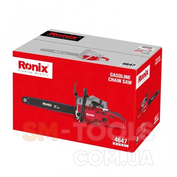 Бензопила Ronix 4647 - идеальный инструмент для распиливания самых толстых стволов деревьев за короткое время и с максимальной точностью. Благодаря своим удобным функциям модель Ronix 4647 способна высокоэффективно справиться с любыми задачами по разрезанию, которые могут возникнуть в лесу или саду. ## Двигатель и механизм Двигатель мощностью 1900 Вт с рабочим объемом 49.3 куб. см делает эту бензопилу способной развивать скорость холостого хода до 3000 об/мин и 8500 об/мин с режущей насадкой, обеспечивая высокую производительность при распиливании материала, имея режущую способность от 40 до 45 см. Бензопила имеет топливный бак объемом 550 мл и масляный бак объемом 260 мл с коэффициентом смешивания масла и бензина 1:25. Система подачи масла в этой модели - это механический плунжерный насос с регулятором для эффективной работы. Благодаря системе зажигания CDI с усовершенствованной функцией синхронизации, пользователи могут наслаждаться мощной и плавной работой этого инструмента. Бензопила также оснащена новой системой умного запуска, благодаря которой инструмент запускается легче и с меньшими усилиями. Система сцепления имеет новую конструкцию, которая обеспечивает лучшую производительность и высокую эффективность, а уникальная конструкция выхлопной системы уменьшает расход топлива и минимизирует выбросы бензина. ## Система смазки Бензопила Ronix 4647 оснащена автоматической системой смазки, которая уменьшает трение между шиной и цепью и обеспечивает более плавное и легкое разрезание. ## Карбюратор Двигатели бензопилы являются двухтактными, а это значит, что двигатель не имеет отдельного бака для масла. Поэтому эта бензопила оснащена диафрагменным карбюратором, который регулирует смесь воздуха с маслом и бензином в соотношении 1:25 и заливает ее в топливный бак, обеспечивая лучшую производительность инструмента. ## Корпус Модель Ronix 4647 весит всего 7 кг без шины, цепи и с пустыми баками. Она оснащена антивибрационной системой, которая предназначена для уменьшения усталости рук во время длительной работы. Длительное использование бензопилы без этой функции может вызвать онемение рук и привести к вибрационной болезни (HAVS). ## Безопасность Эта бензопила оснащена специальным предохранительным механизмом, который уменьшает риск получения травм во время использования инструмента. ## Упаковка и комплектация Бензопила 4647 поставляется в цветной коробке Ronix, в которую входят следующие комплектующие: пила, направляющая шина, рукав направляющей шины, бутылка, отвертка, рашпиль и торцевой ключ. ## Особенности - 2-цилиндровый двигатель мощностью 1900 Вт с рабочим объемом 49.3 куб. см и высокой производительностью - Автоматическая система смазки уменьшает трение между шиной и цепью и делает разрезание более плавным и легким - Антивибрационная система обеспечивает более комфортное использование инструмента и уменьшает усталость во время длительной работы - Специальный предохранительный механизм снижает риск травмирования во время распиловки - Новая система умного запуска облегчает запуск бензопилы - Новая система зажигания гарантирует мощную и плавную работу - Специальная конструкция выхлопной системы снижает расход топлива и минимизирует выбросы бензина - Новая конструкция системы сцепления обеспечивает лучшую производительность и более высокую эфф