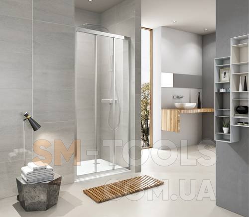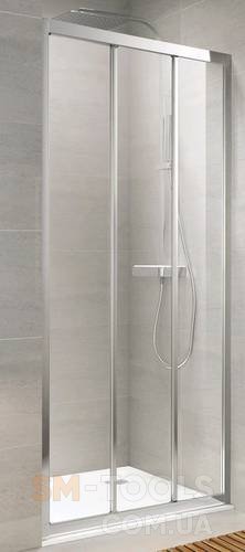 Душові розсувні трисекційні двері TT90 доступні в прозорому та матовому склі, розміром 900x1900 мм, товщиною скла 6 мм та хромованим профілем.