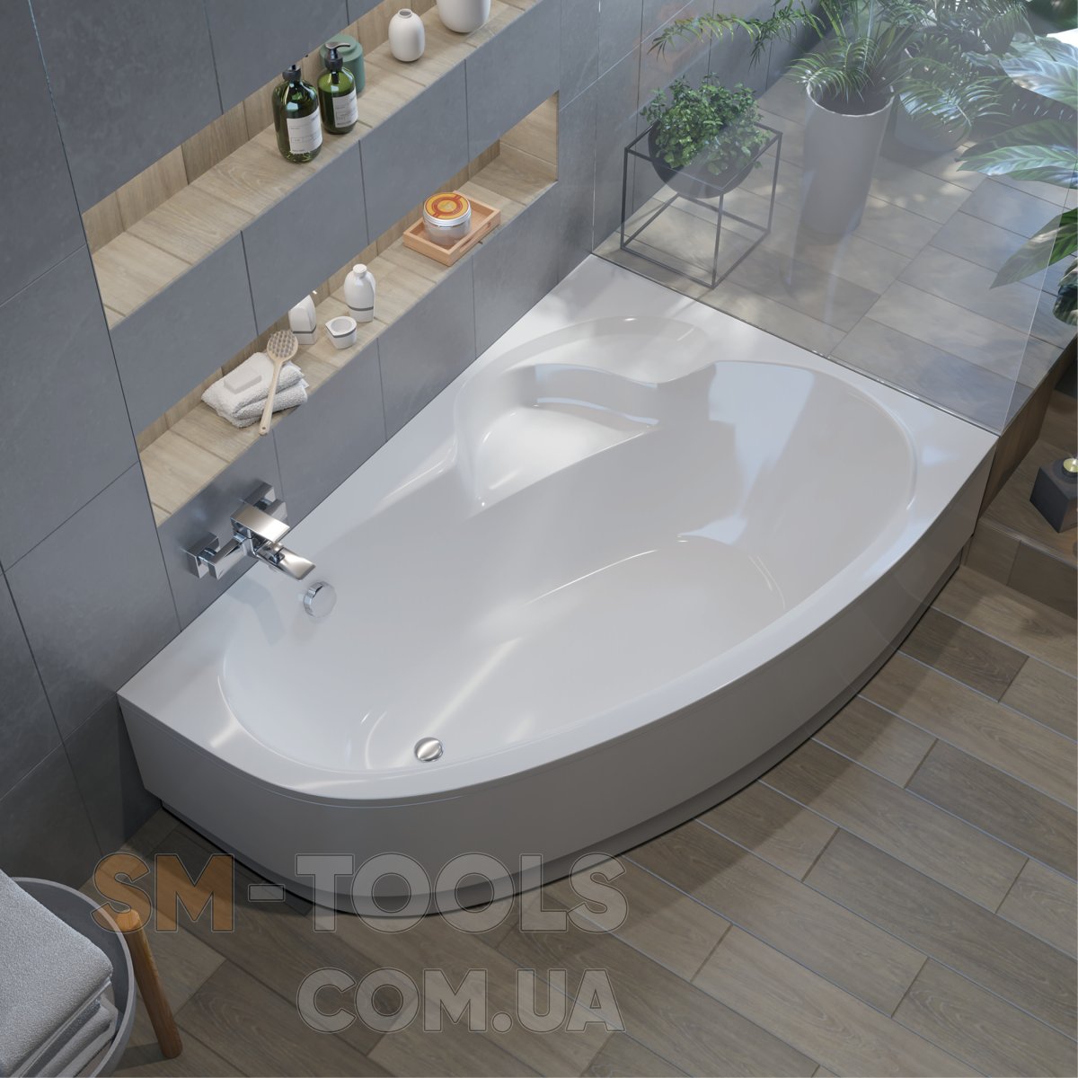 Асиметрична ванна Karina виготовляється в ліво- та правобічному варіантах, має оптимальні габаритні розміри і при цьому виглядає стильно та акуратно. Овальна форма внутрішнього простору ванни прикрашена вигином під поличку.