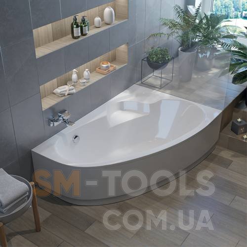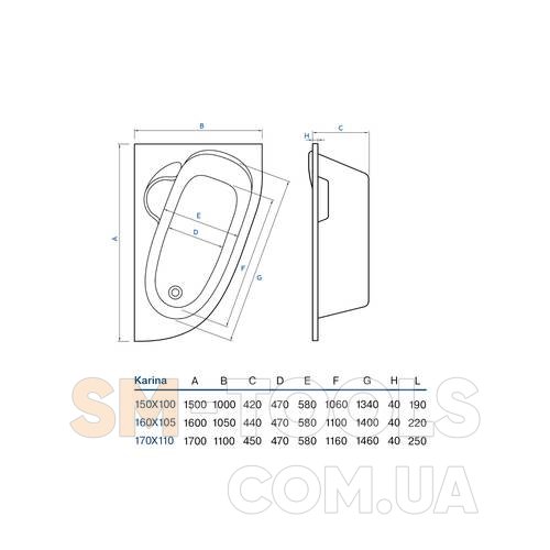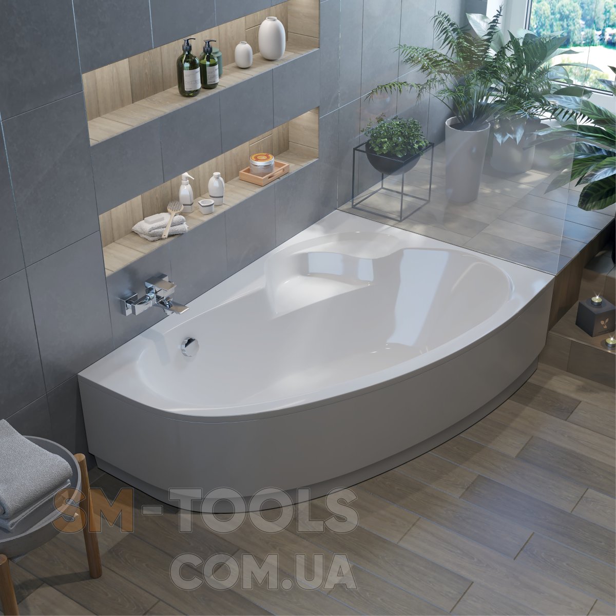 Асиметрична ванна Karina виготовляється в ліво- та правобічному варіантах, має оптимальні габаритні розміри і при цьому виглядає стильно та акуратно. Овальна форма внутрішнього простору ванни прикрашена вигином під поличку.