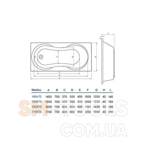 Опис Ванна прямокутна акрилова KOLLER POOL серії Malibu 150x70 (MALIBU150X70)