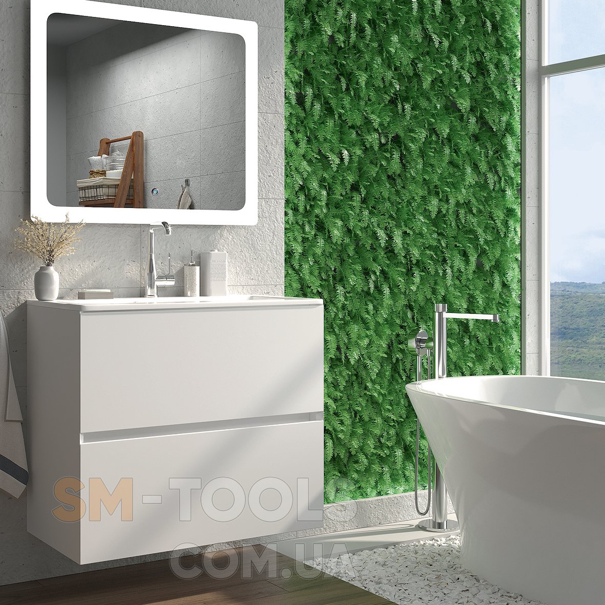 Колекція меблів NEON CUBE – консольна тумба з шухлядами плавного типу закривання. Можлива ширина тумби: 60 / 70 / 80 см. Колір білий. Умивальник штучний камінь.