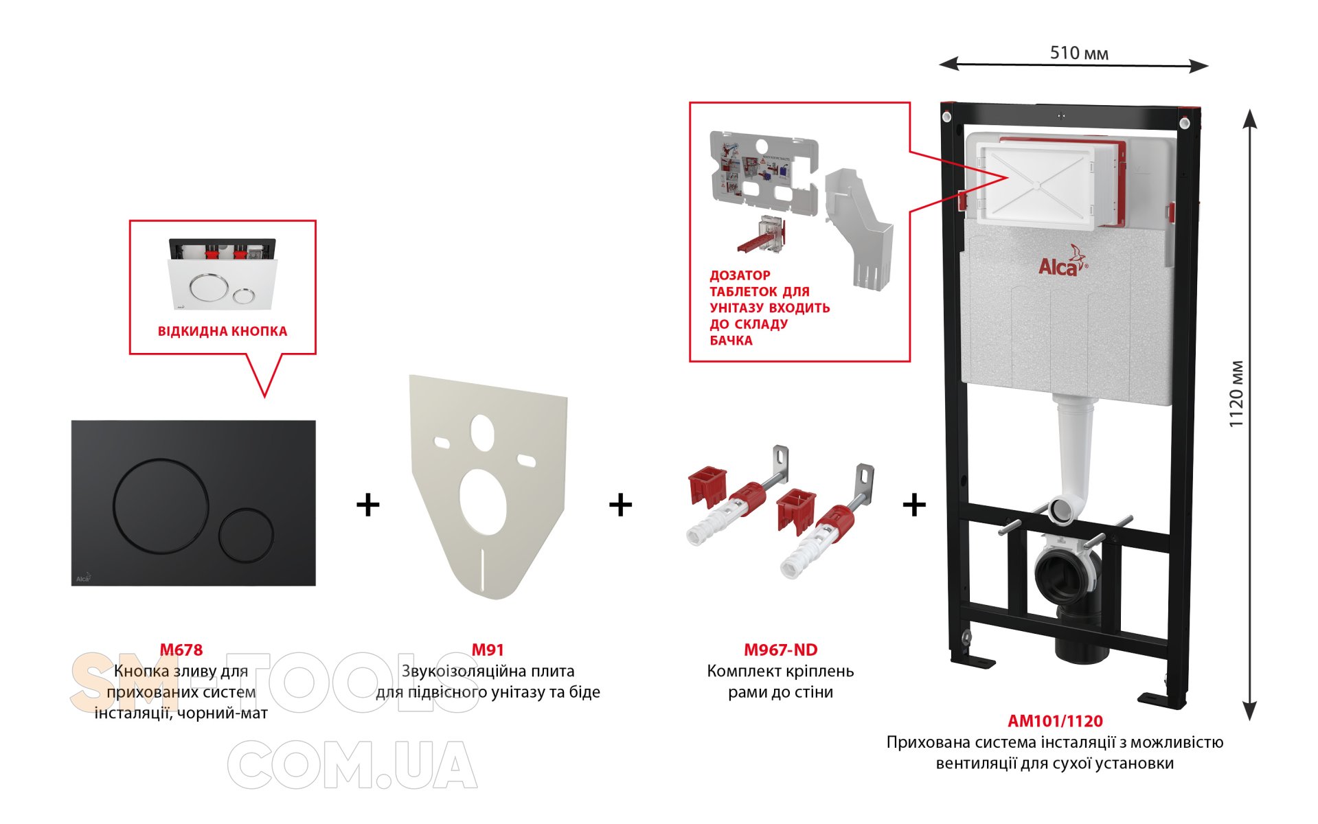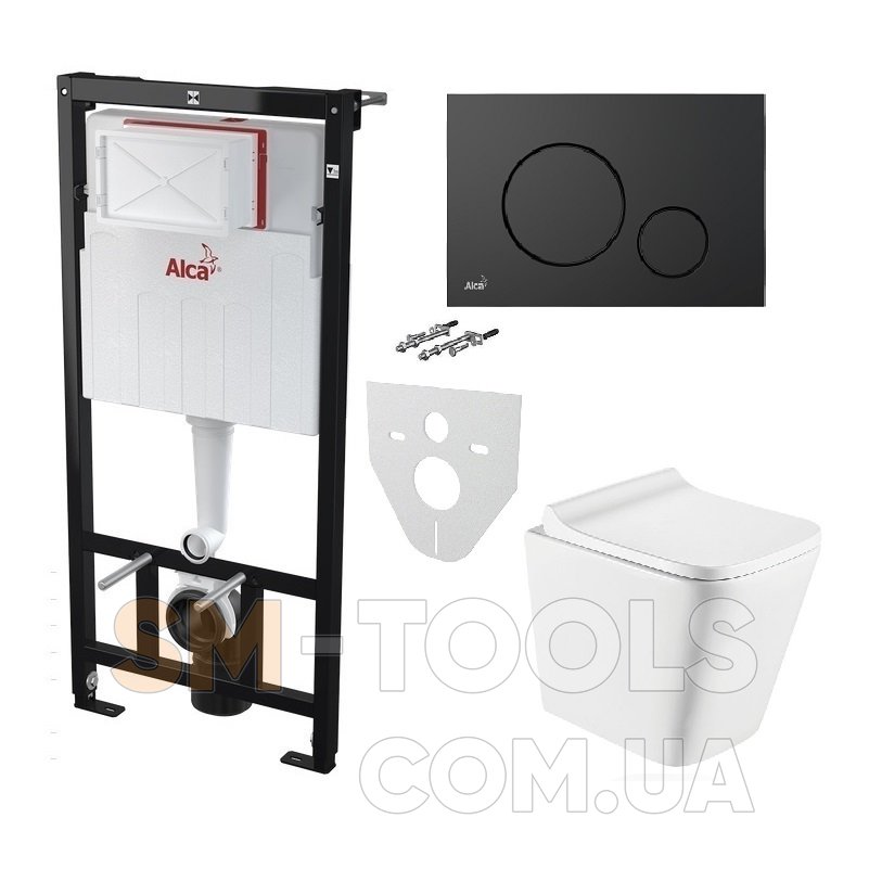 Инсталляция AlcaPlast 4в1 AM101/1120 с черной круглой матовой кнопкой M678 + подвесной унитаз TREND (AM101/1120-4:1 RU M678-0001 + TR-0490-RW)